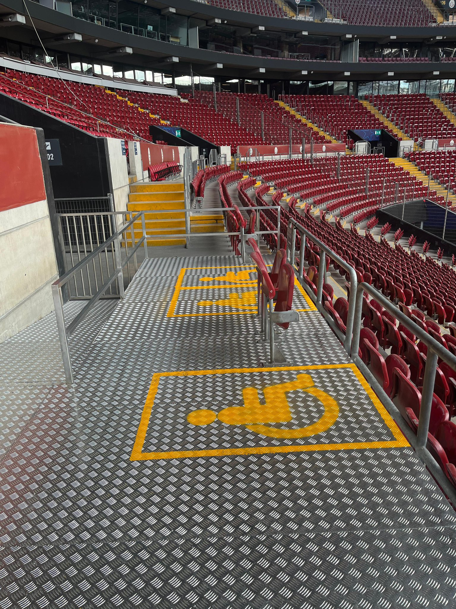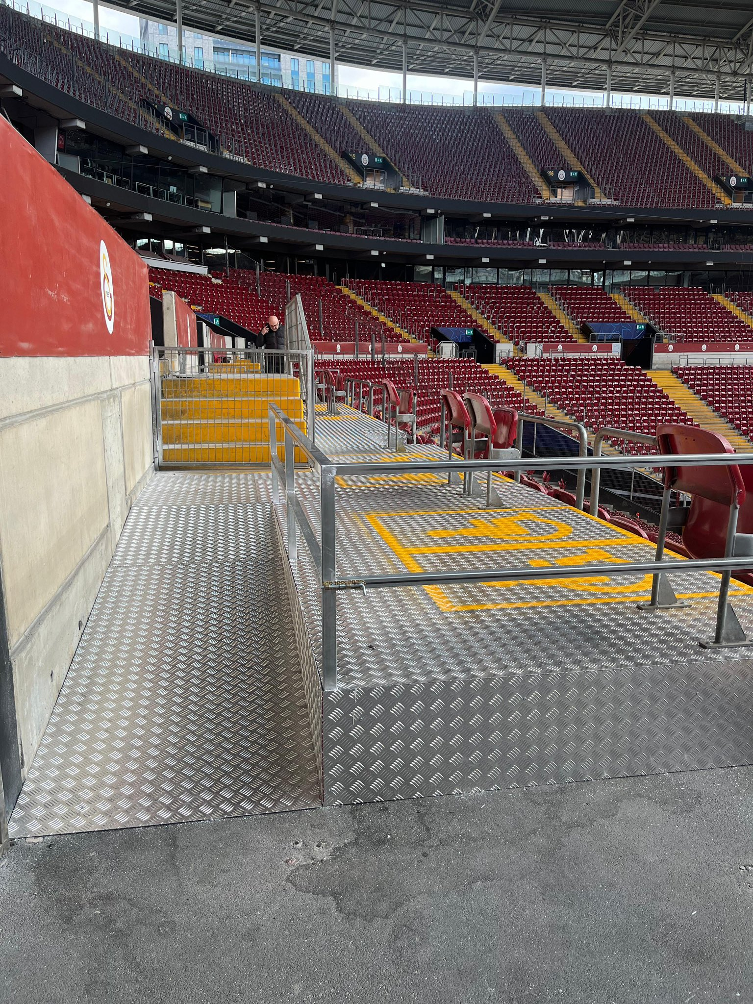 这是加拉塔萨雷新建的专用轮椅观赛平台。去年 9 月客场时,曾遇到一些问题,但加拉塔萨雷不仅着手解决,更是超出了预期。残疾人球迷会感谢两家俱乐部以及欧足联的出色协作