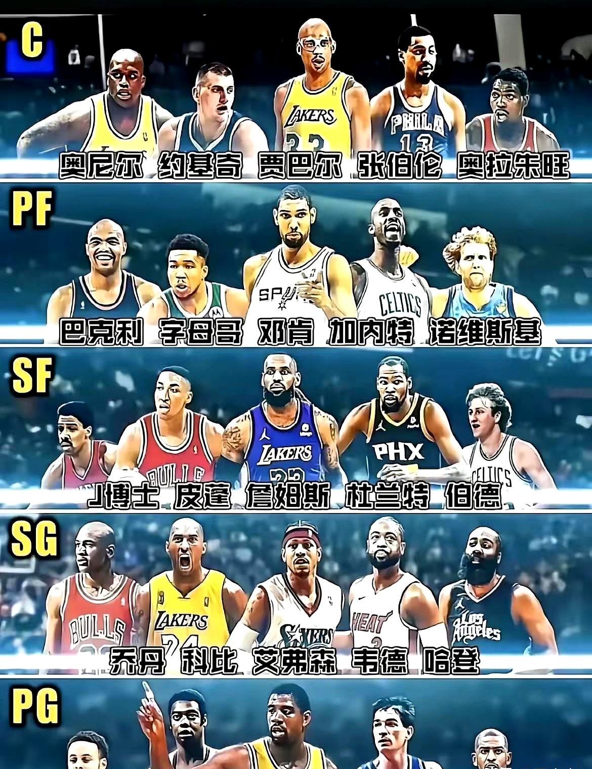 吵了快二十年乔丹詹姆斯谁更强,真不如看各位置历史前五来的实在。 得分后卫乔丹稳坐头把交椅,科比韦德艾弗森哈登依次排下来,全联盟没几个球迷能挑出硬伤。 控卫位魔术师和库里争第一,斯托克顿保罗稳坐前五席位,差别无非是新旧球迷的偏好不同。 小前锋詹姆斯毫无争议压伯德一头,杜兰特皮蓬紧随其后。大前锋邓肯站C位,巴克利加内特诺维茨基随便排都掉不出前五。 中锋位天勾拉塞尔张伯伦奥尼尔奥拉朱旺摆出来,就算是最挑的老球迷也说不出不配俩字。 跨位置比高低全是嘴炮,同位置拼硬货才见真章。你觉得还有谁配不上自己位置的前五?