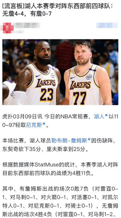 再说没有詹赢前四4次这个 这里面一个是打森林狼 d77暴走49分,另一个是小李单核打败森林狼,最后是一次没有福克斯的马刺,马刺赛季初可没这么吊 还被勇士吊锤2次 是福克斯付出以后才一路北伐,现在居然变成湖人赢强队的证明了 真是可笑,詹东搭配可是赢掘金 ( 约没打)但把福克斯没打算进去 掘金居然不算 不懂为什么 。事实就是湖人这赛季打强队尤其挣扎 毕竟打雷霆一节花这种事 就算太阳也未如此 东里唯一有含金量的一次还要算这次赢尼克斯。