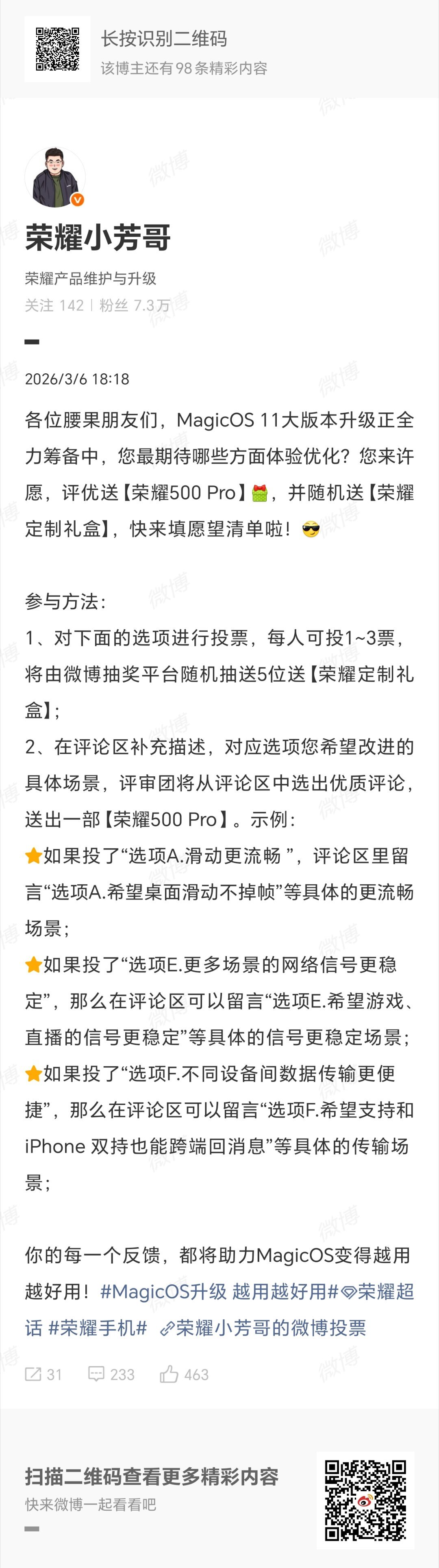 荣耀产品维护与升级 小芳哥宣布,MagicOS 11 系统大版本“正全力筹备中”。
