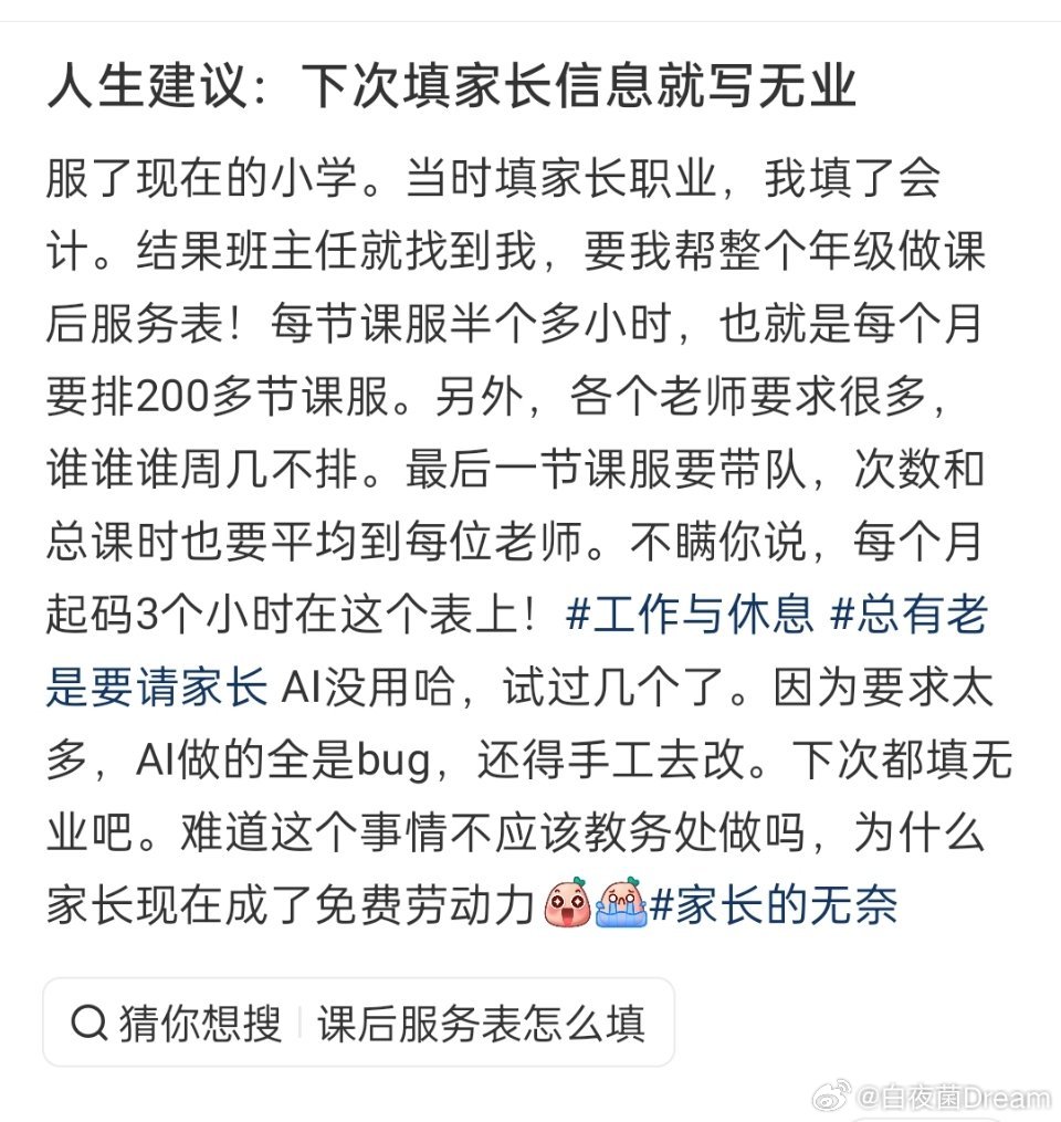 吃吃 2 2026-03-09 22:30 我们填了医生,我媳妇也就是让去讲个公开课,启发孩子们对医学的兴趣,其他班里孩子父母有法官律师的也去做过普法教育,有程序员也去讲过AI,差不多每个学期都有几次,各行各业都有,都是为了孩子呗,还能有别的什么啊。