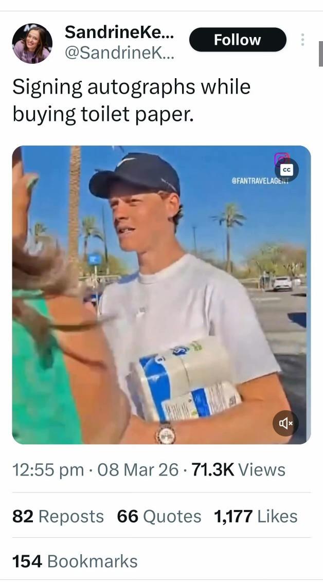 2026年3月,有球迷在印第安维尔斯的超市偶遇世界排名第一的网球选手辛纳。当时他正在购买厕纸等日用品,被认出后友好地为球迷签名。 药加辛真的很奇怪,难道组委会不会提供厕纸吗?想起2021年药加辛假上卫生间一事,就知道他有多虚伪……