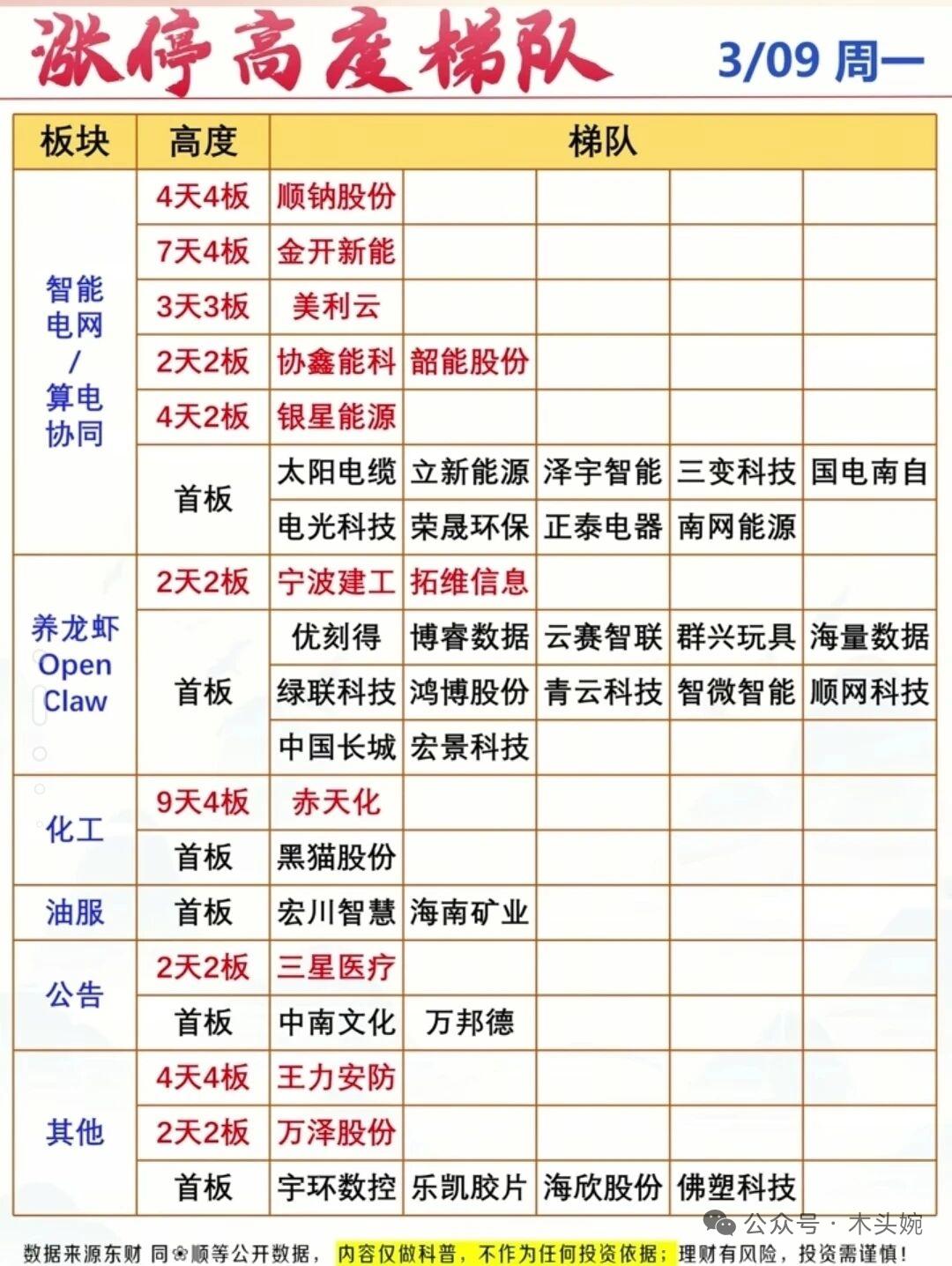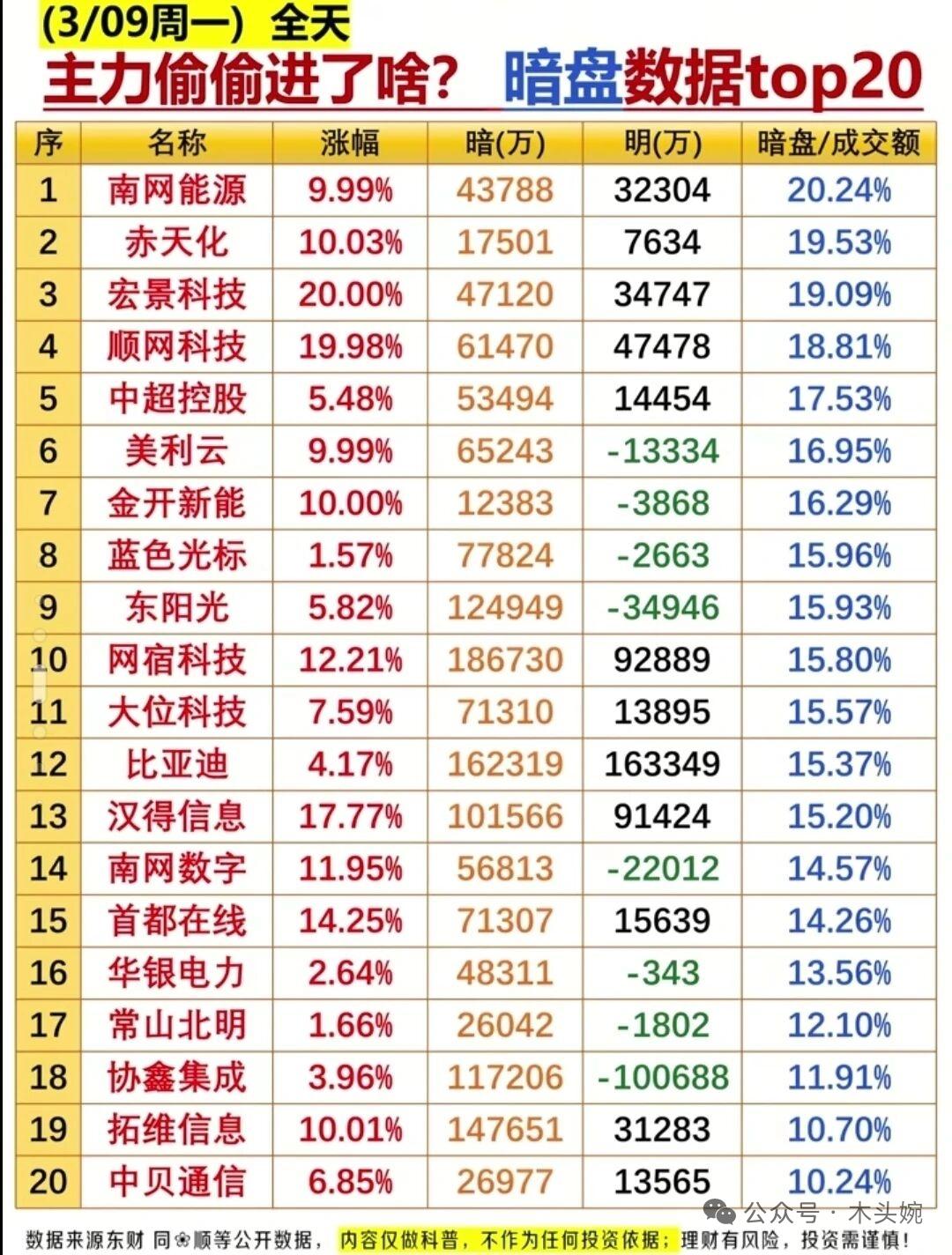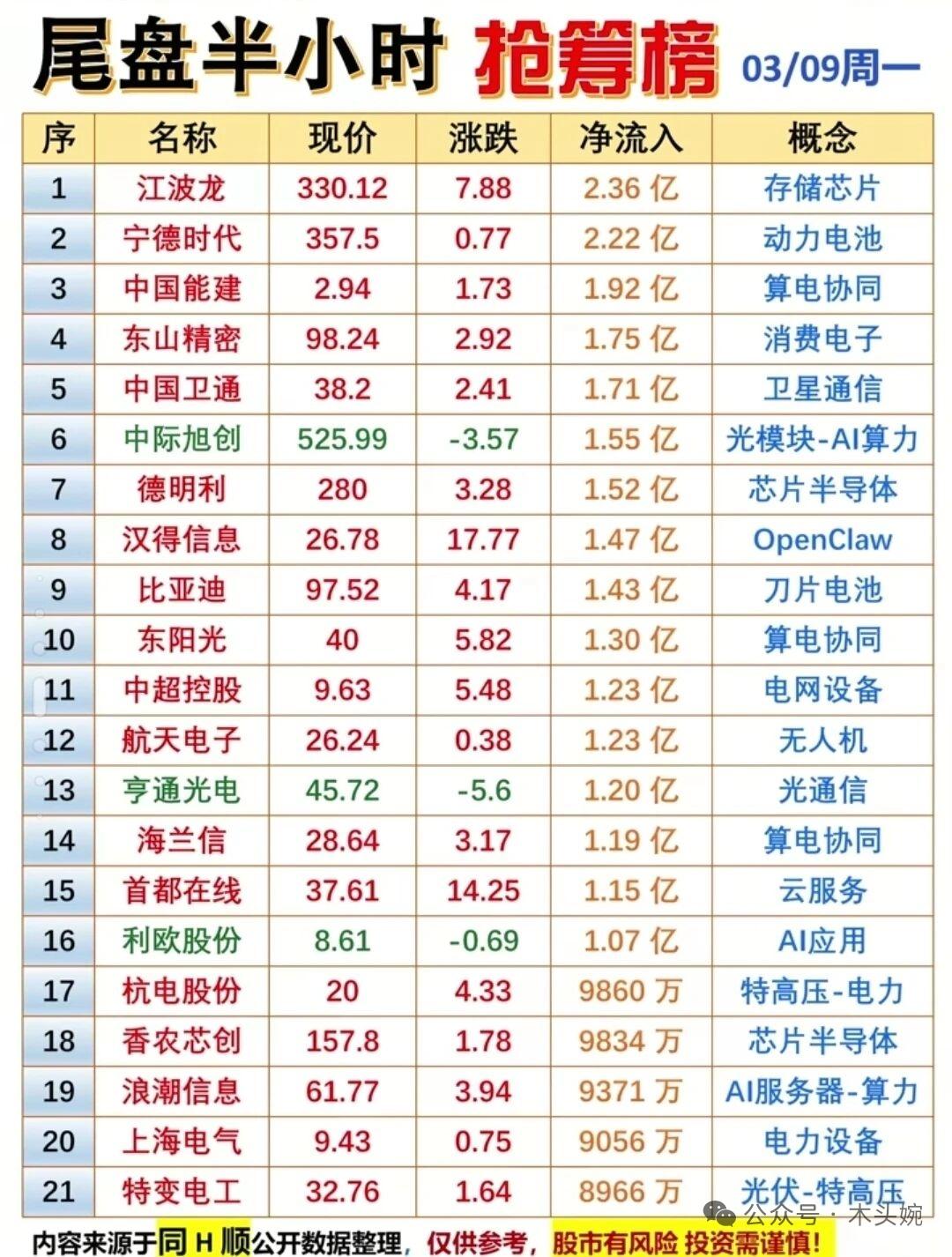 3月9日主力动向曝光!(暗盘数据+尾盘抢筹+主力资金流入等等) 全天主力净流入抢筹榜:比亚迪、中国长城、阳光电源领衔,AI算力、储能、光伏赛道获重点布局; 暗盘数据显示,南网能源、宏景科技、顺网科技等暗盘成交占比超18%,资金抢筹意愿强烈; 尾盘半小时江波龙、宁德时代、中国能建等获资金加速流入,算力与储能板块持续吸金。 涨停梯队方面,智能电网/算电协同、养龙虾OpenClaw两大主线热度最高,连板股与首板股形成梯队效应,市场主线清晰,资金聚焦高景气赛道。 ⚠️ 风险提示:以上内容仅为市场数据复盘,不构成任何投资建议,理财有风险,投资需谨慎。