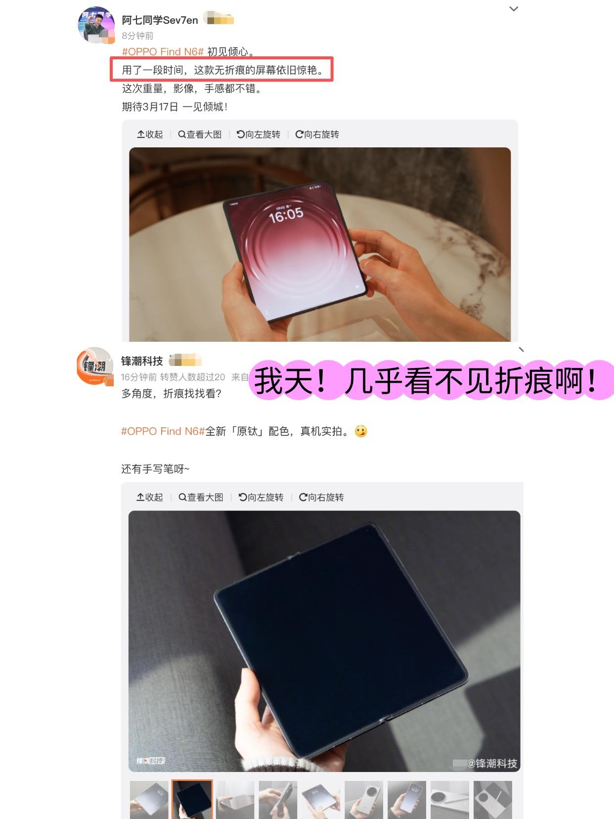 20多万人预约!OPPO Find N6这么火吗? 今天看到OPPO Find N6公布外观了,很多博主提前上手了,我很喜欢那个橙色,看起来很有活力,没那种折叠屏那种商务感觉,很适合年轻人,而且网上很多人说用了一段时间后折痕还是几乎看不见,这真有点东西呀。 Find N6的亮点除了这个折痕控制优秀,据说2像素哈苏四摄的拍照提升很多,AI手写笔的加入让大屏使用效率更高,就是不知道这个笔有什么功能了?之前Find N5有不错的全景虚拟屏,能同时打开三个应用在前台显示,这次配合手写笔使用起来应该更高效。 现在我就很心动这个折痕控制,已经预约了!就看3月17号发布时什么价格了。 OPPOFindN6 OPPO折叠屏 手机数码 手机分享 FindN6无感折痕 OPPO 全球最平整折叠屏OPPOFindN6
