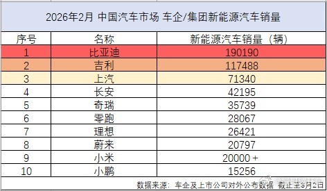 2026年伊始,中国新能源汽车市场的竞争态势愈发清晰。依据车企及上市公司公开披露的数据显示,比亚迪2月份新能源汽车销量达到190190辆,再度斩获行业销量桂冠!