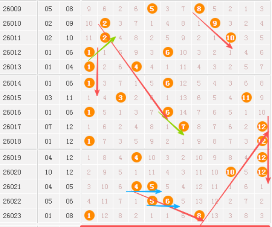 26024期大乐透一等奖选号策略剖析! 上期大乐透开奖号码为9、25、26、27、28。其中,龙头号码为重号,还出现了一组四连号25 - 26 - 27 - 28。从区间分布来看,区间比为1:0:4,二区呈现断区状态。大小号码比例为4:1,奇偶号码比例为3:2,同时存在两码重号与三码冷号的情况。 本期结合近30期的走势进行分析,断一区的情况出现了4次,断三区的情况出现了5次,且均有连续断区的现象。三连号共计出现4次,且多集中于二区。在三连号的走势进程中,常常伴随着重号走势。例如,在25149期和25150期的走势里,连续出现一区断区的状况,并且连续两次出现三连号,同时还伴随着1次三斜连号。26009期同样呈现三连号走势,也伴随着重号走势。在26015期和26016期连续断三区的走势中,还伴随着4斜连号的走势。或许这些走势之间存在着异曲同工之妙。 综上所述,本期选号可考虑以下两种方案: 方案一:延续断区态势。龙头号码依旧看好热号奇数,重点关注斜连号走势;三区继续看好重号,凤尾号码以热号偶数为主。 方案二:号码走势回归正常。区间比看好为2:2:1,大小比为3:2。龙头选取奇数,凤尾选取偶数,防范1码重号情况,着重关注两码斜连号走势。(会员请以走势图画线解析作为选号依据)
