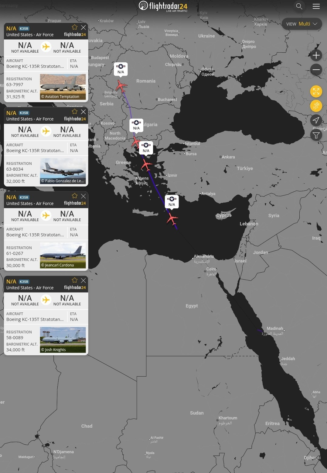 🔻三架 KC-135R 同温层加油机正从特拉维夫(本古里安机场)飞向欧洲,另有一架正从沙特阿拉伯的苏丹亲王空军基地出发。🔻这四架加油机在战争开始前几天从乌代德空军基地重新部署至此。🔻现在,疑似由于防空能力的削弱近一步后撤了。🔻数据来自 F24美被迫中止军事行动的可能性上升曝美不满以袭击伊朗燃料存储设施海外新鲜事中东现场直击
