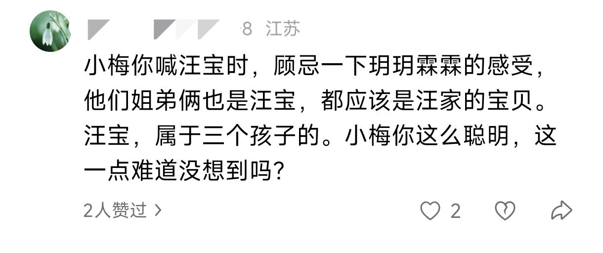 网友谴责马筱梅喊儿子为汪宝,不顾及小玥儿姐弟的感受。 马筱梅直播时跟大家说汪宝很乖,醒了也不哭闹,就自己睁着眼睛在那看来看去。 结果评论区有网友认为,汪宝应该是汪家宝贝的意思,是属于三个孩子的称呼,可马筱梅却把自己的儿子喊为汪宝,丝毫没有顾及小玥儿姐弟的感受,质问她真的没想到吗?