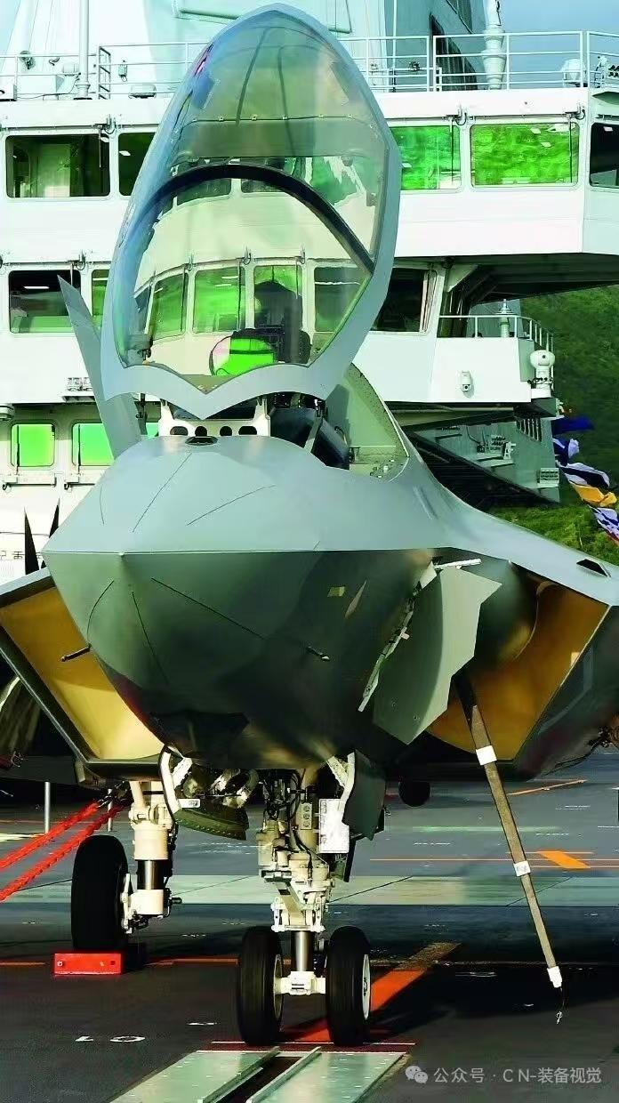停放在福建舰弹射器起飞位置的歼-35隐身战斗机,这个角度比较少见,可以清楚的看到左侧进气道的结构,DSI的鼓包彻底遮挡住发动机叶片,这个设计基本上和歼-20类似,二而进气道前唇边沿的结构相比歼-20要简单,估计这里的涡流发生会少一些。 主起落架和前起落架都有非常粗壮的主立柱,而且看上去液压缓冲行程很长,用以满足在着舰时巨大的冲击力。