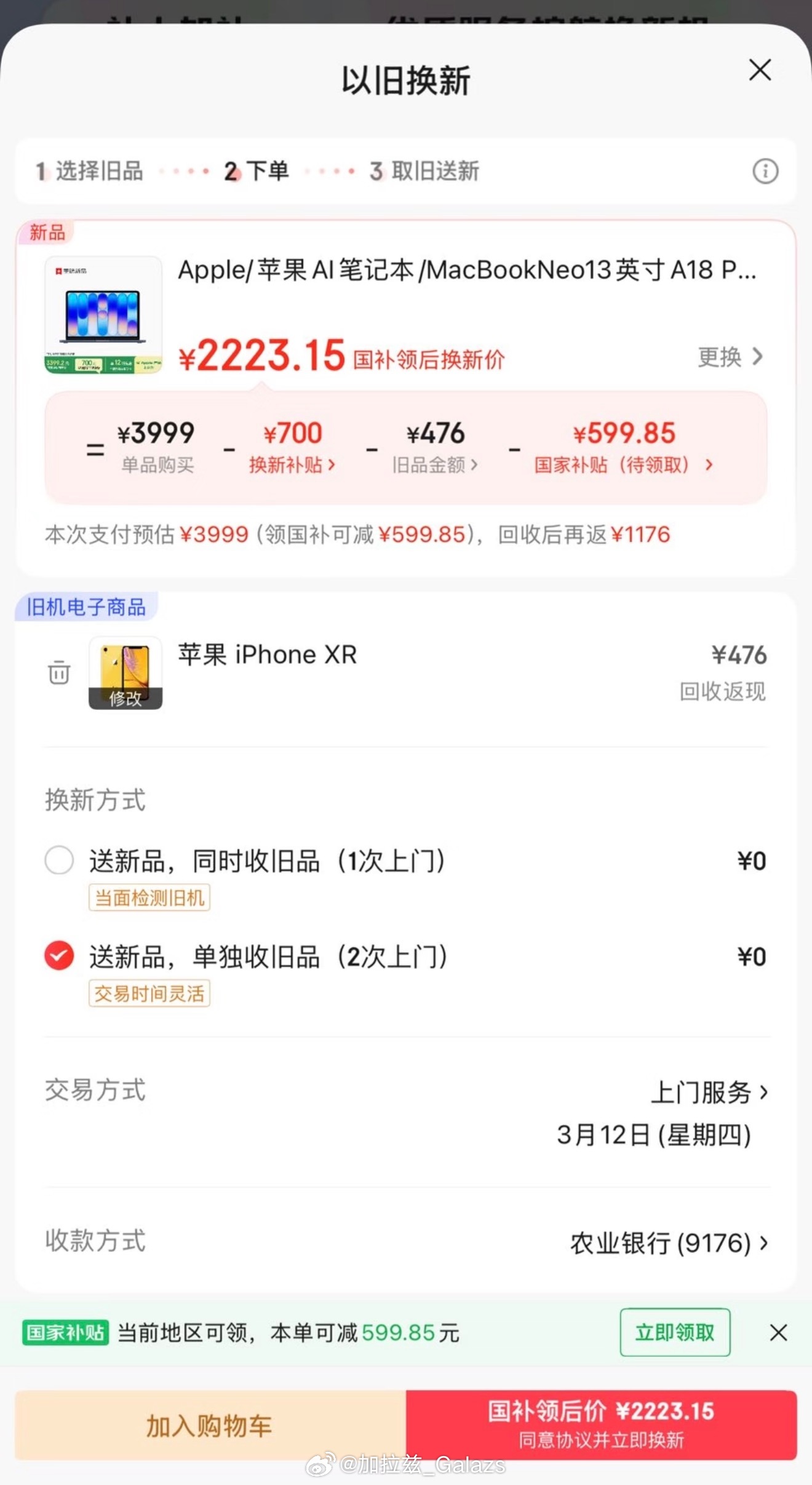 MacBook Neo 最新最低价格2223.15元网友把所有buff 叠满,同时选择“2”次上门,最后只花了 2k 出头拿下 MacBook Neo,比入门iPad价格还低🍋
