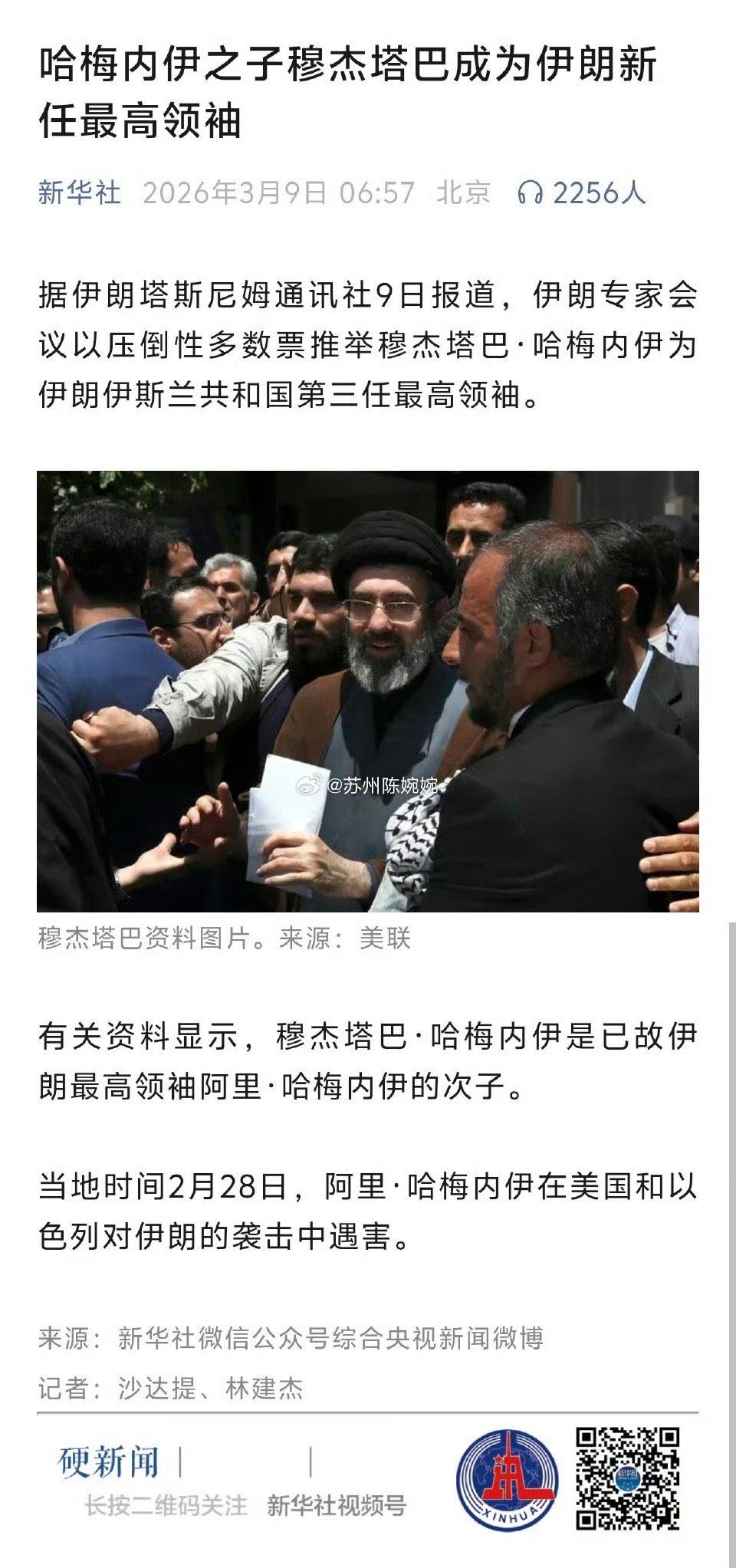 现在好了,美以炸死了哈梅内伊,殉国也殉道/教,新华社新闻里说的是压倒性多数票