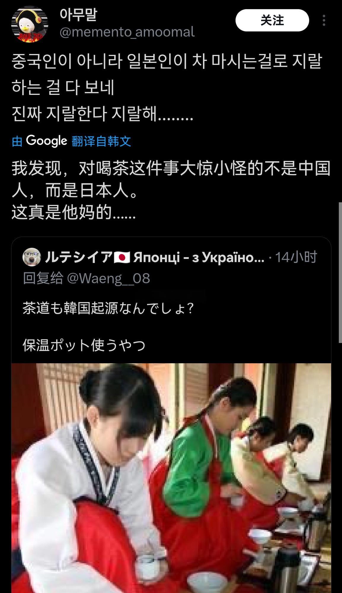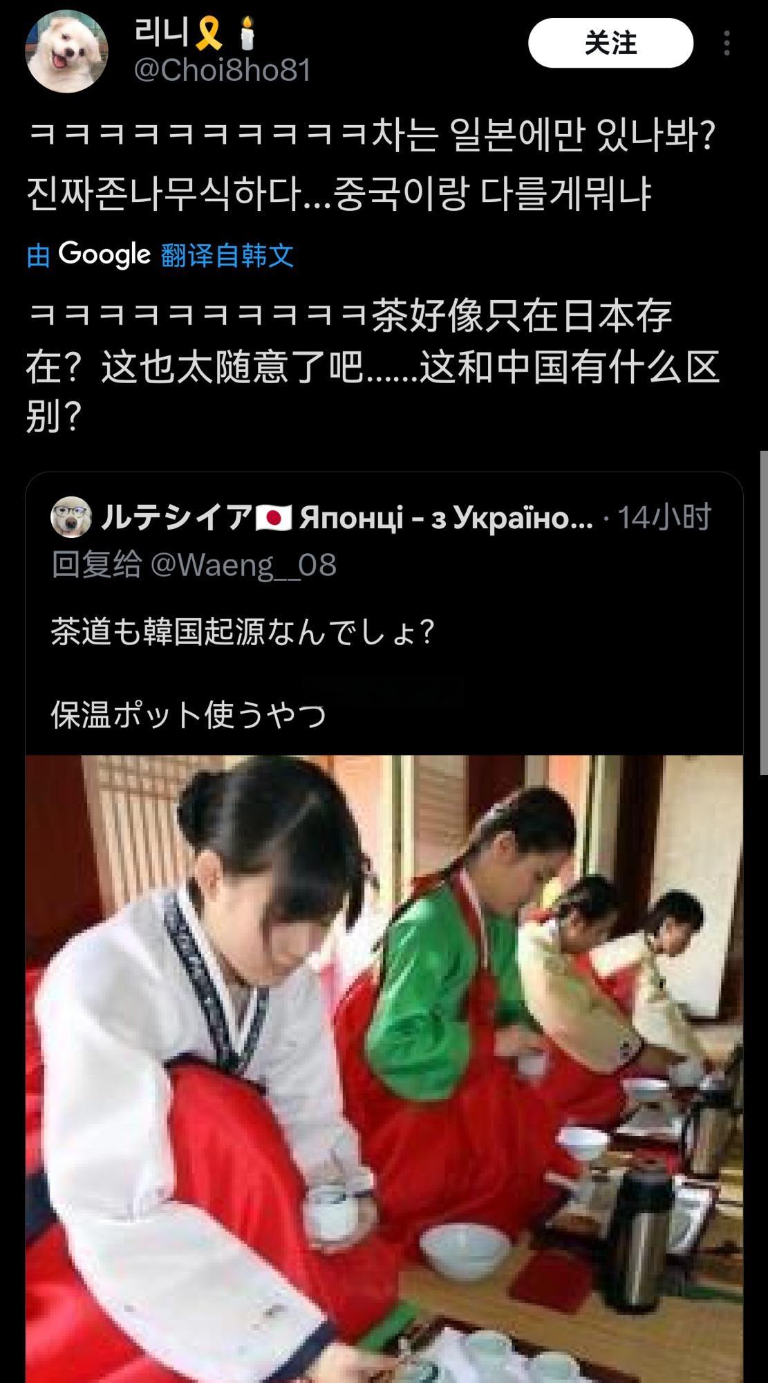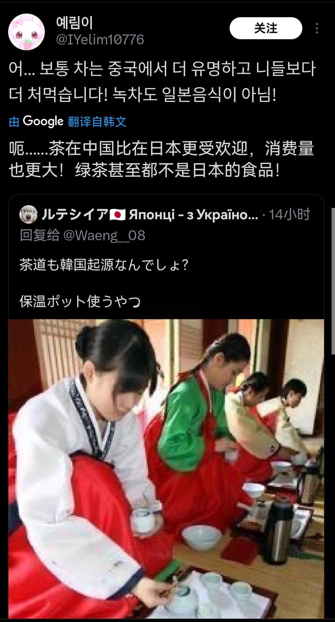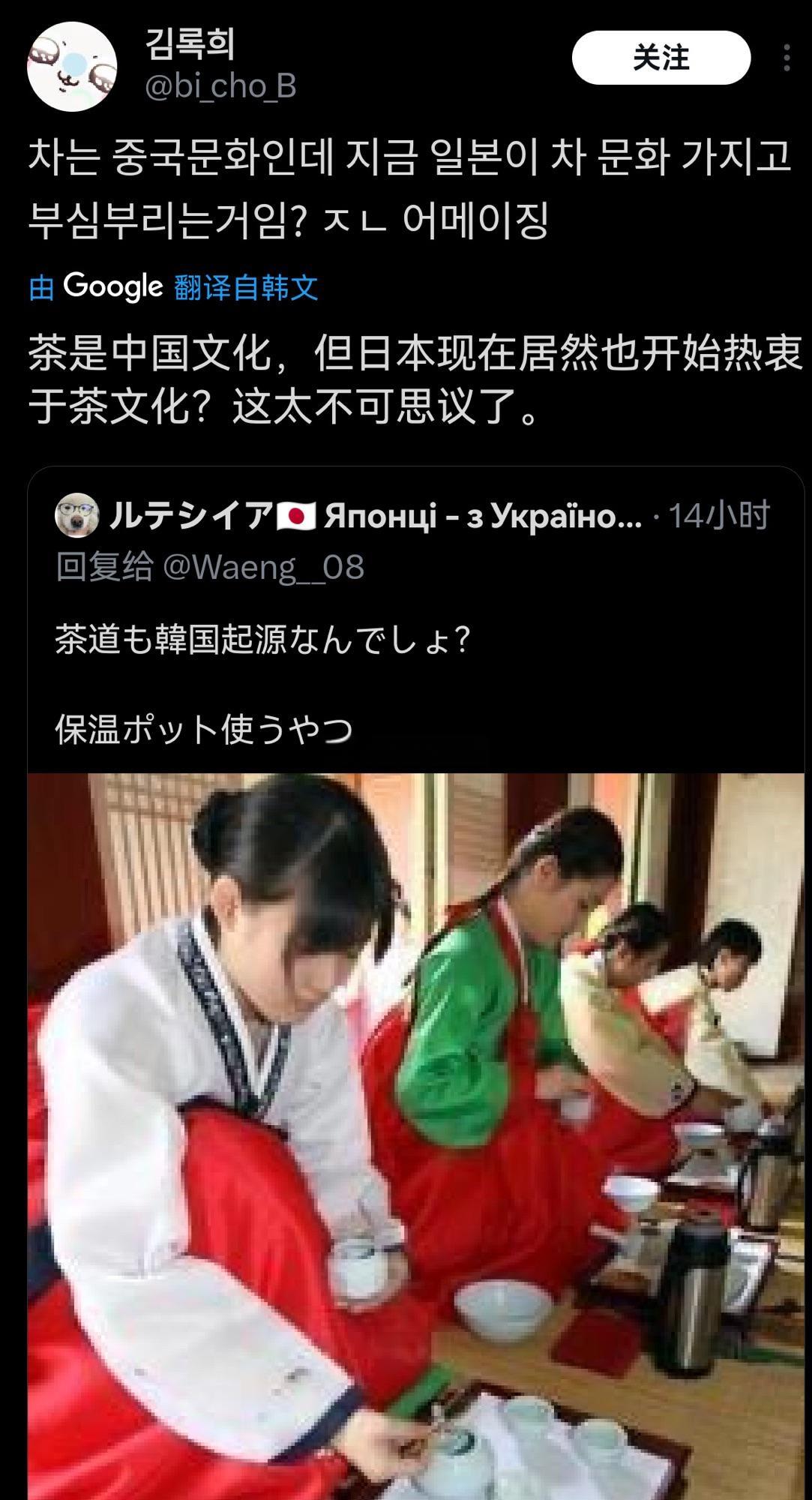 近日,日本网民嘲笑韩国人用保温壶装热水泡茶,指责他们偷窃日本的茶道… 韩国网民反驳:茶起源于中国,没人说过是韩国的! 大家看,在他们互相指责的时候就都知道是中国的了! 而且从读音上就说明了一切,茶(chá) 、차(cha) 、お茶(o-cha) ,后面总是“缺斤少两、画蛇添足”…