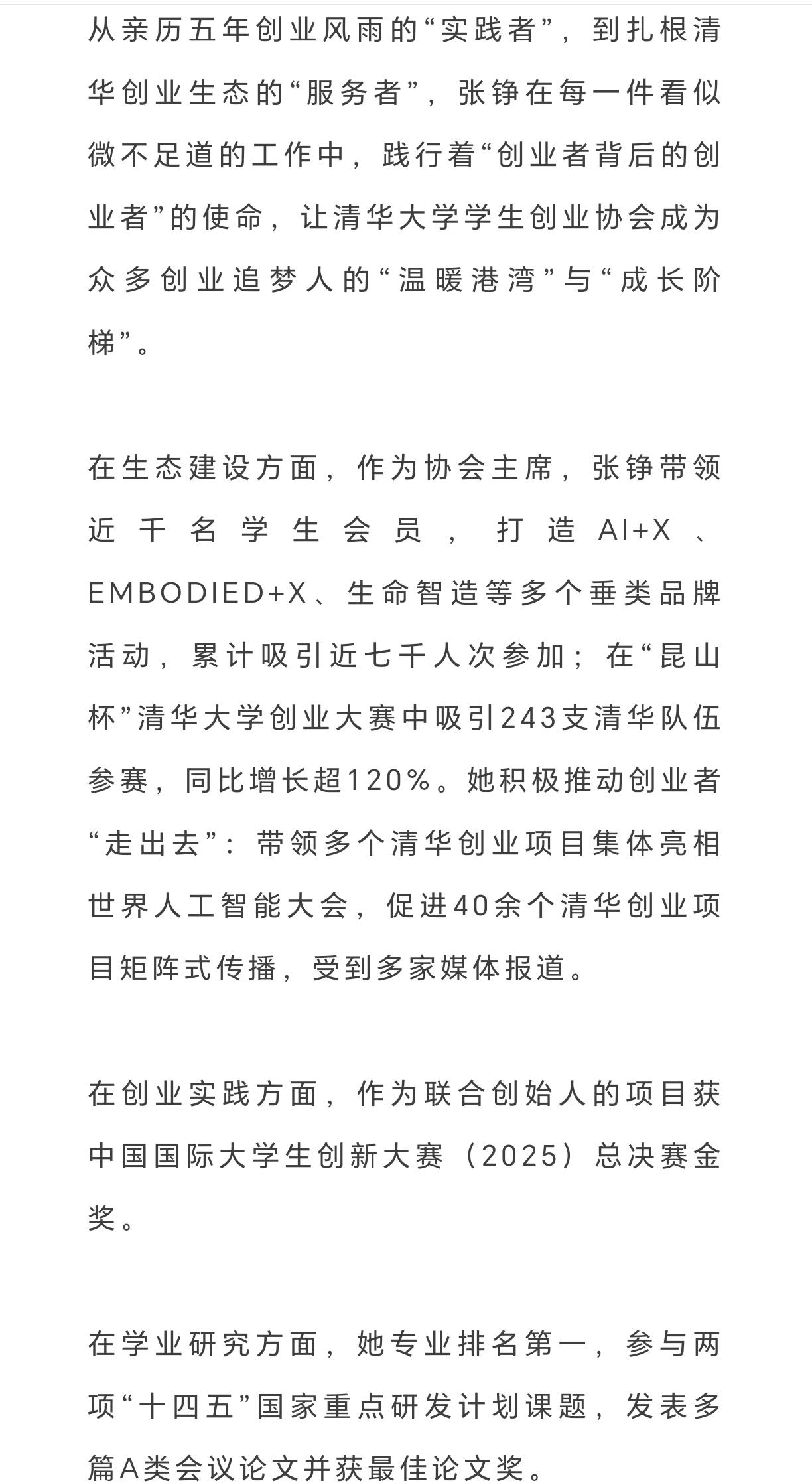 清华女博士太逆天,一建随便过,创业拿国奖,颜值还超高。 张铮,清华大学23级建筑学院博士生, 不仅是清华学生年度人物,还是国家一级注册建筑师! 可我发现,她明明手握这么硬核的建筑资质,那么难的执业考试,她仿佛轻轻松松就拿下,现在却压根不做传统建筑相关工作,一心扑在创业上。 更厉害的是,她还拿下了2025中国国际大学生创新创业大赛总决赛金奖,而且创业方向,居然也和建筑不搭边。 科研上同样开挂,多篇A类会议论文、最佳论文奖在手。 考试强、创业强、科研更强,关键颜值还超高。 我就特别好奇, 这姑娘到底睡不睡觉? 别人一天24小时,她是不是有48小时? 上帝到底给她关了哪扇窗?