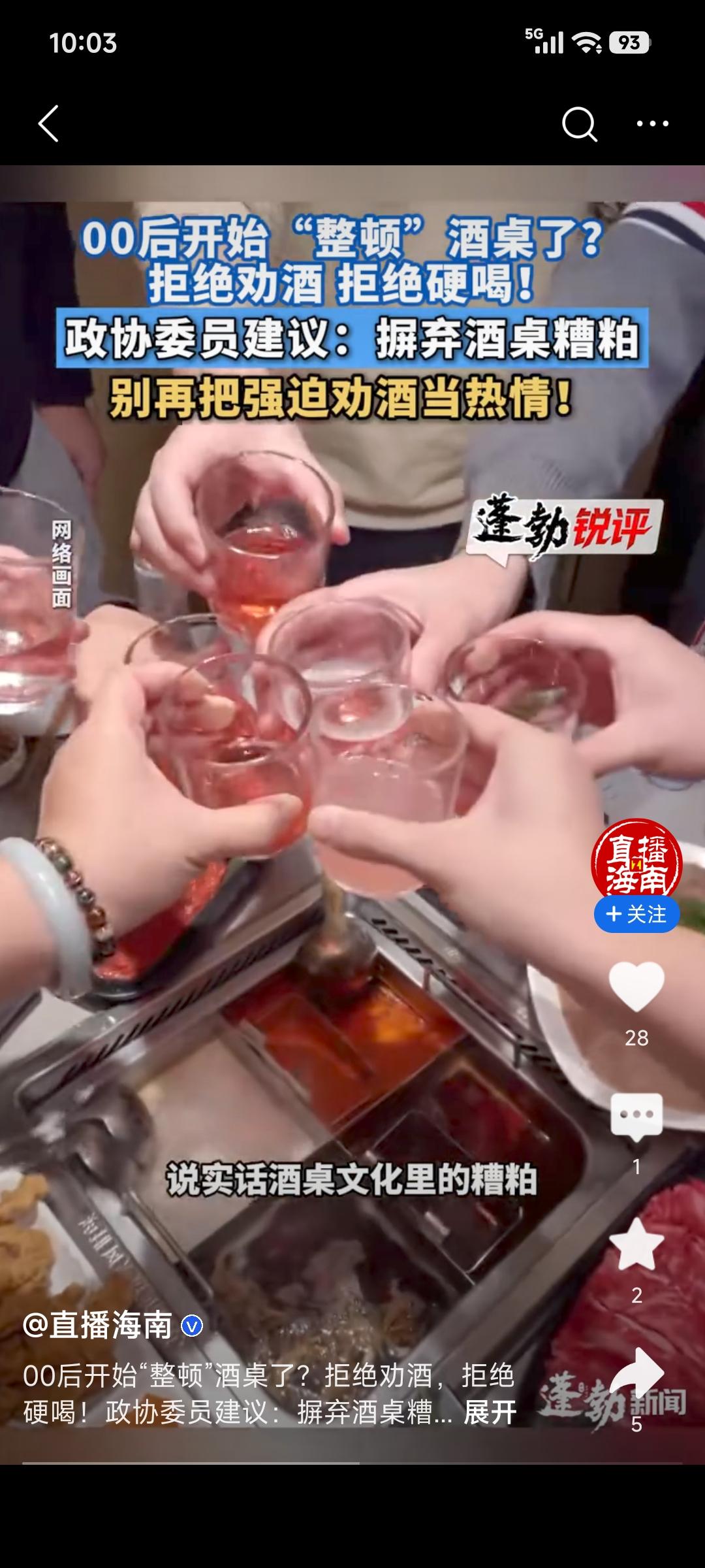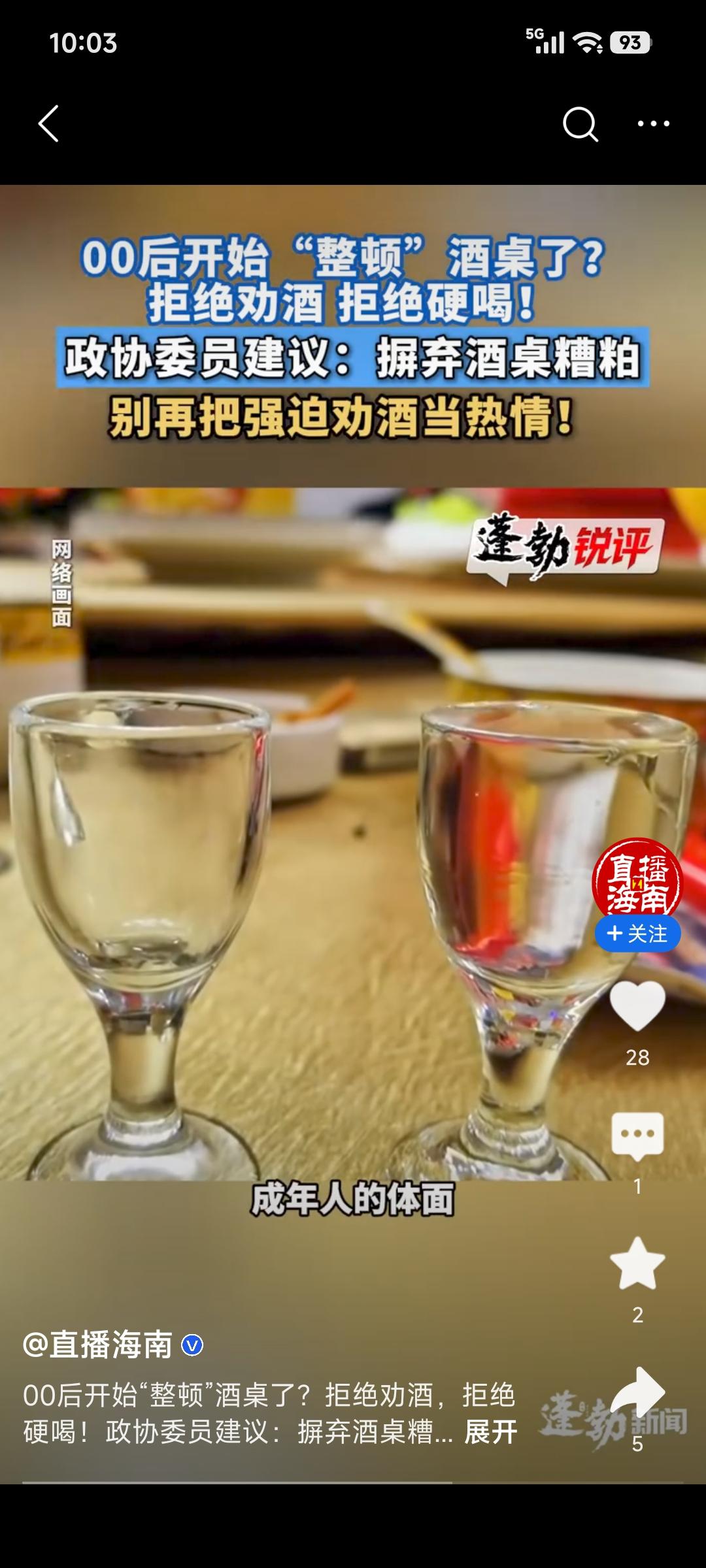 00后拒绝劝酒这事儿太赞了,委员力挺更是大快人心!以前酒桌上那套劝酒文化,什么“感情深一口闷”,简直是道德绑架。很多人碍于面子,明明不想喝也得硬着头皮上,最后喝得难受还伤身体。 00后可不吃这一套,他们更注重自我感受,不想喝就是不喝,管你什么理由。这是一种进步,是对传统不良酒文化的反抗。委员力挺说明大家开始重视这个问题了。希望以后酒桌上能少点劝酒的陋习,多点真诚的交流,让喝酒真正成为一种享受,而不是负担。