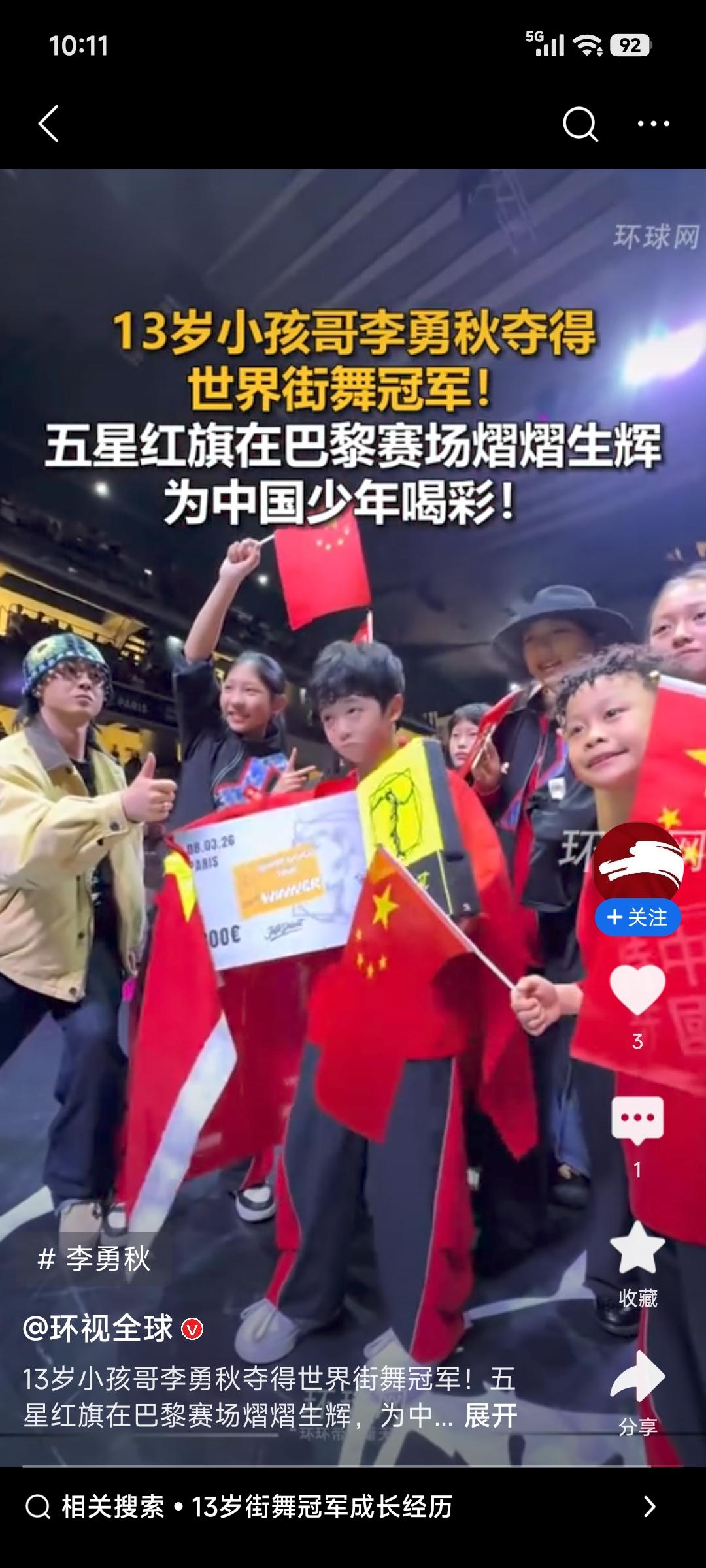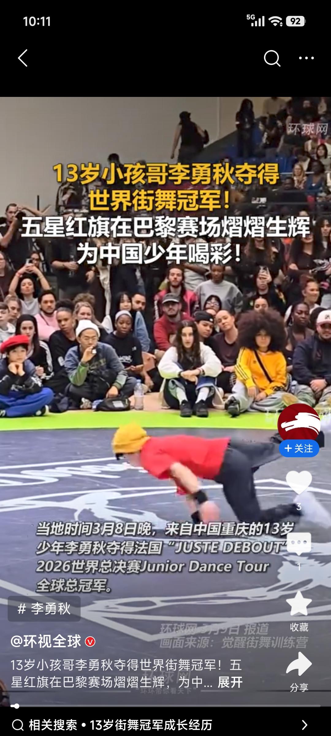 最近街舞圈被一个13岁的中国小孩哥点燃了!当地时间3月8日晚,在法国巴黎的Juste Debout 2026世界街舞总决赛上,重庆少年李勇秋(秋秋)拿下Junior Dance Tour组别的全球总冠军,成了中国首位在该项目夺冠的B - boy。 比赛中他开局失误、节奏被压,但迅速调整,把托马斯全旋、倒立定格做到极致,用中国风舞步征服全场。他5岁起每周训练5 - 6天,自律到别人玩游戏时他都在练动作。夺冠时他只有一个念头:“我一定要赢!”这就是中国新生代,热爱可抵万难,未来可期!