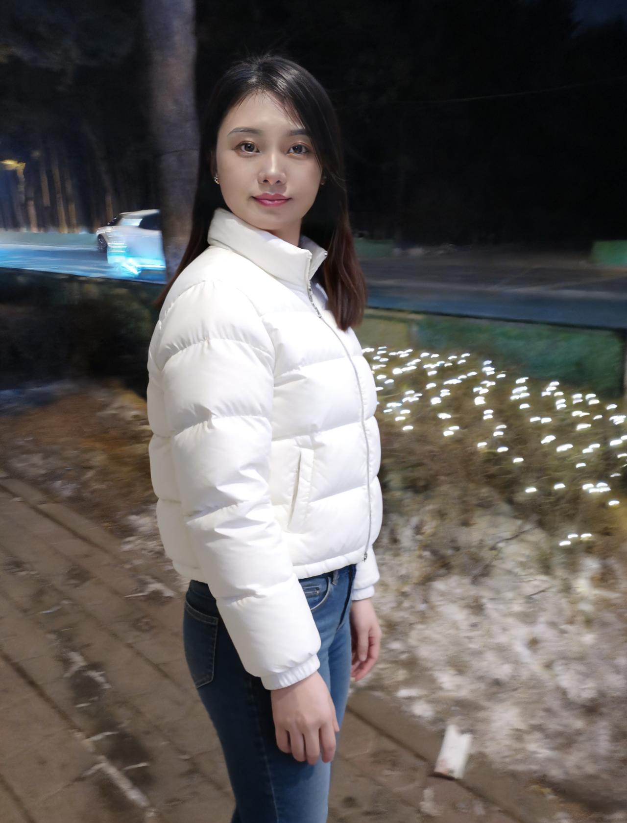 星稀月淡夜悠悠,雪覆长街灯影柔。 白衣胜雪临寒陌,青丝如瀑拂肩头。 回眸恰遇风撩