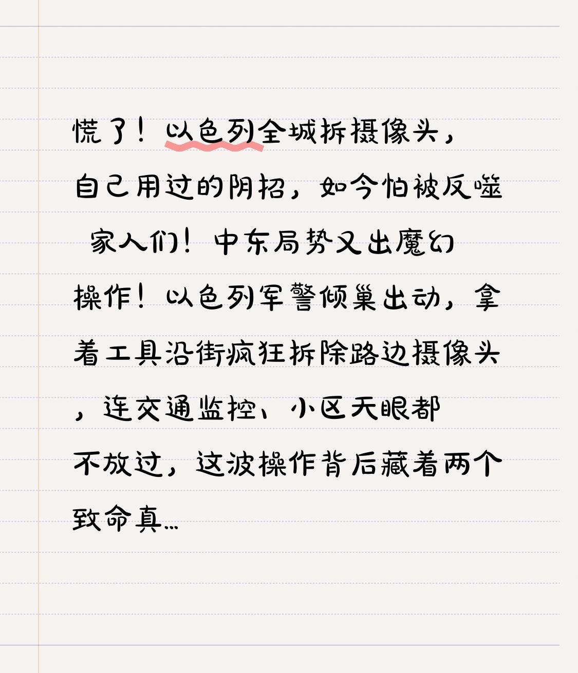 慌了!以色列全城拆摄像头,自己用过的阴招,如今怕被反噬 家人们!中东局势又出