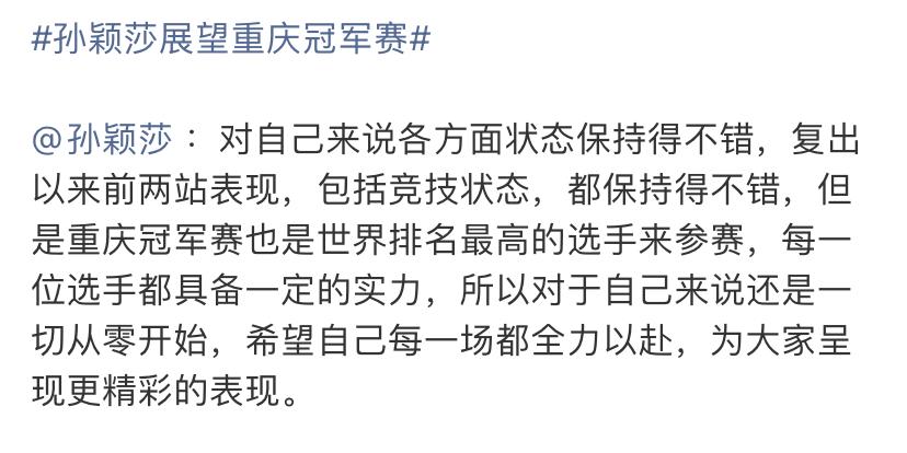 重庆冠军赛赛前,孙颖莎快速讲出2个重点, 1句话说明压力很大,周围还有人拍照, 眼睛在转动,大脑不断思考。 竞技状态不错,2026年比赛,孙颖莎除了跟王曼昱决赛,基本都是3-1或4-1战胜对手,展现出极高的竞技水平。 复出2站得到认可,莎莎复出一共打了2场比赛,都是冠军,她也是自信的给予自己肯定。 世界排名最高的选手来参赛,每一位选手都具备一定的实力,突出比赛有一定困难,但是,莎莎从来不畏惧困难。 我女儿用力的拍了我肩膀下,大声喊道,莎莎赛前发言讲得真好!我点了点头,这就是世界第一的大格局。
