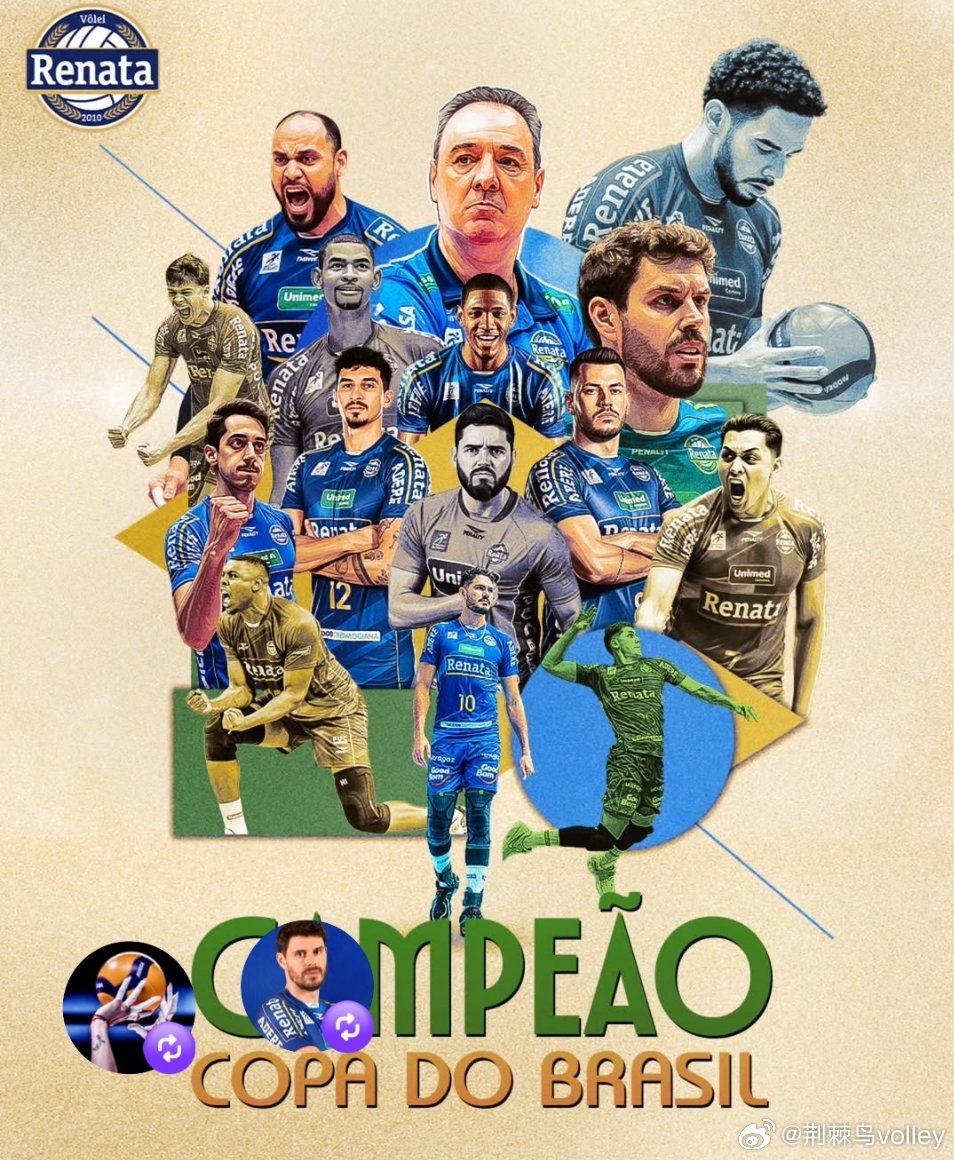 男排巴西杯决赛,少爷布鲁诺效力的雷纳塔坎皮纳斯3-1(21/25, 25/23, 26/24, 25/17)逆转道格拉斯带领的冠军球队克鲁塞罗,首次夺得杯赛冠军。值得一提的是雷纳塔上周刚刚赢得了南美锦标赛冠军。