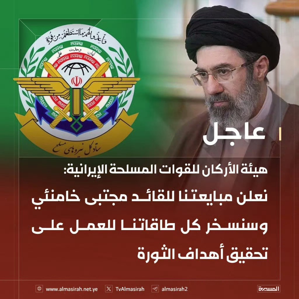 伊朗伊斯兰革命卫队宣誓效忠伊朗新任最高领袖穆杰塔巴·哈梅内伊。作为忠诚士兵和强大的权力支柱, 支持尊敬的领导专家委员会的选择, 我们准备完全服从并无私地执行阿亚图拉·赛义德·穆杰塔巴·哈梅内伊先生的神圣指示。小哈梅内伊比老哈梅内伊的反犹意识更强,反西方的态度更坚定。现在看, 美国和以色列在战争之初就暗杀了老哈梅内伊可能是整体战略上的失败。