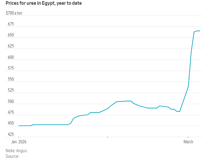 阿格斯数据显示,截至上周五,运往埃及的尿素价格自冲突开始以来已经上涨超过50%。用于生产尿素和其他化肥的原料氨价格也上涨了18%。