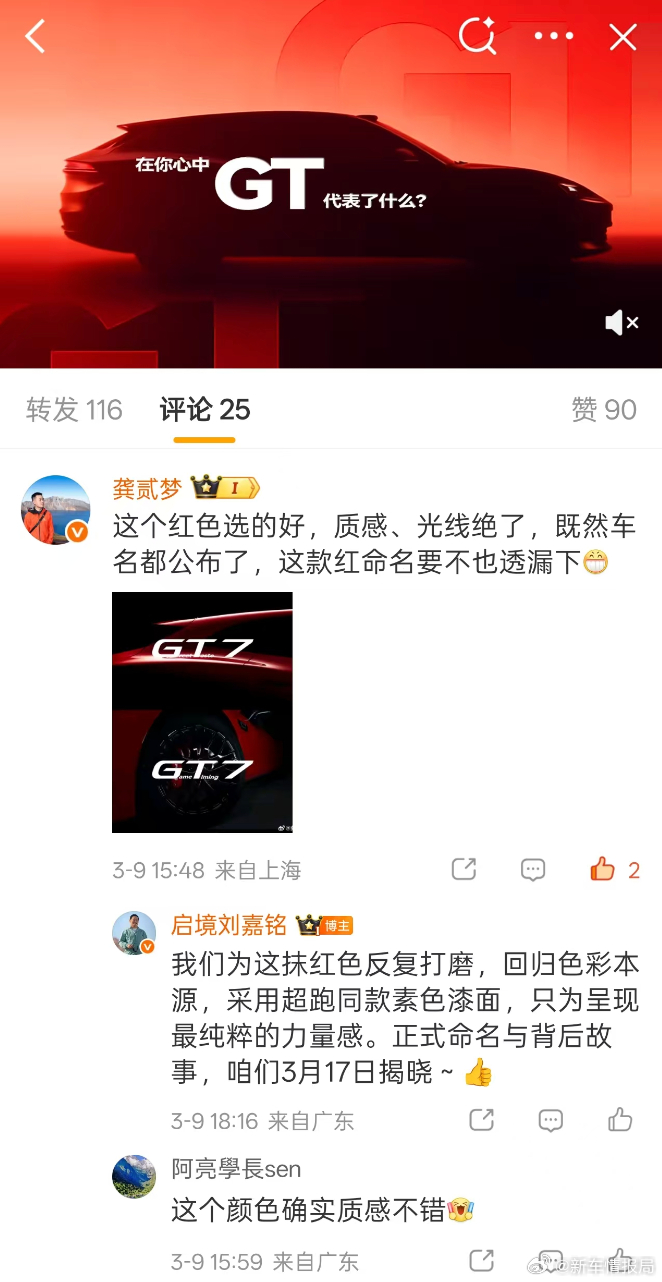 刘嘉铭同时透露,该配色的正式命名与背后故事,将于3月17日正式揭晓,进一步点燃了网友对启境GT7的期待值。
