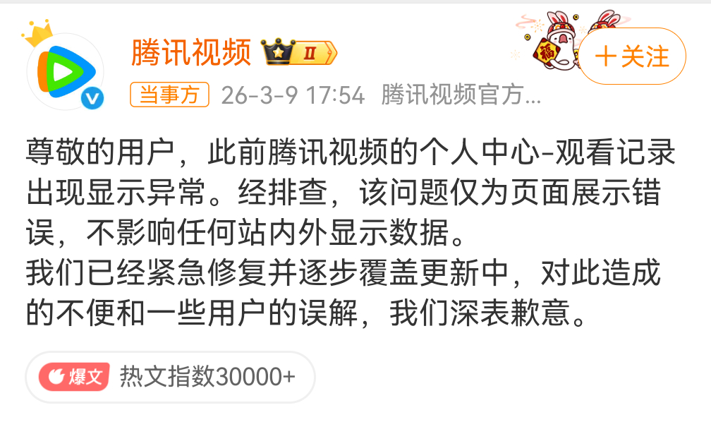 腾讯近期因内容违规被罚 腾讯视频回应了,说是观看记录出现了显示异常,而且仅为页面展示错误,不影响任何站内外显示数据。你们信不信呢?