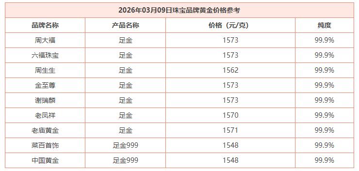 今天是3月9日, 还有半个小时, 就是新的一天啦, 赶紧把当日的品牌黄金价格补上。 周一,国内品牌黄金普遍性回落。 菜百和中国黄金报价1548元; 周生生黄金报价1562元; 老凤祥价格为1570元; 老庙黄金价格为1571元; 周大福、谢瑞麟等四家品牌报价1573元。