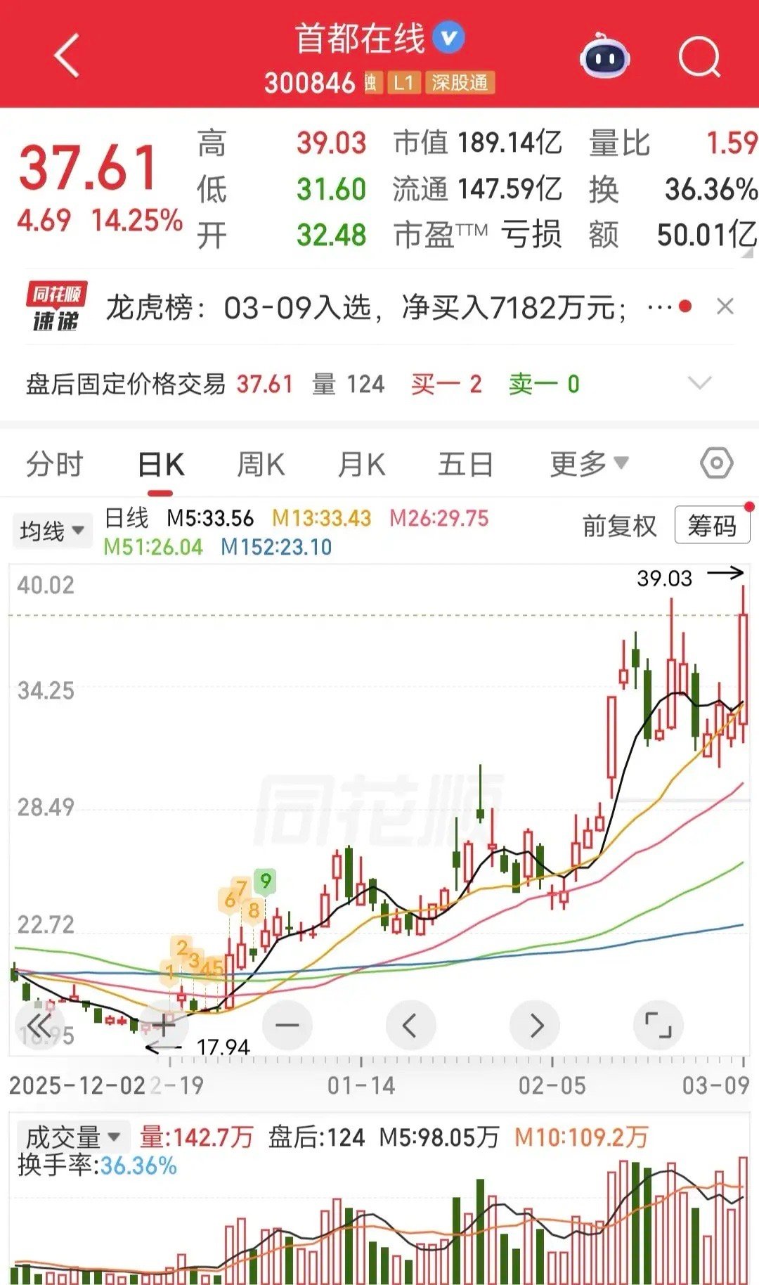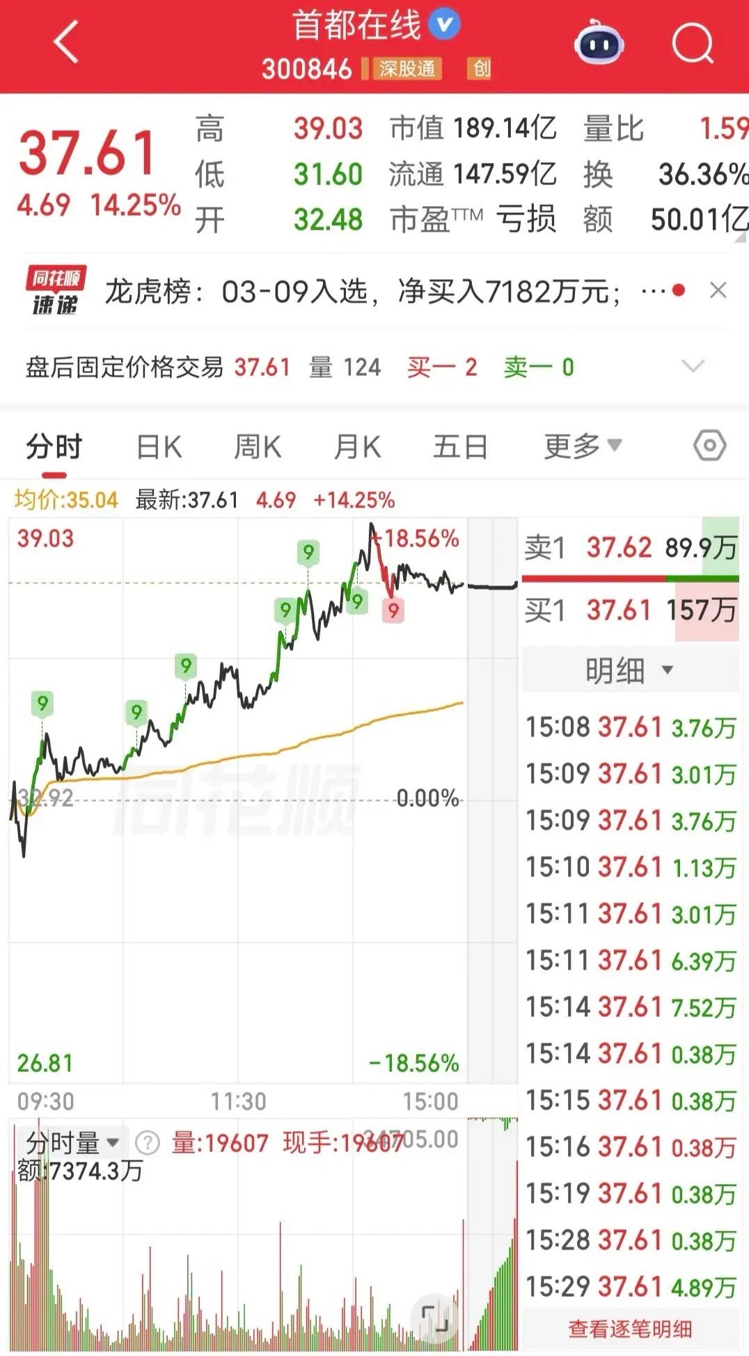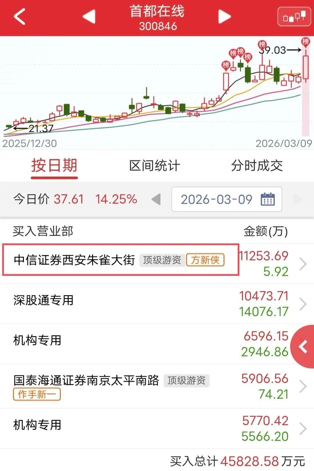 盘后龙虎榜显示,方新侠买入首都在线1.1个亿,作手新一跟买。