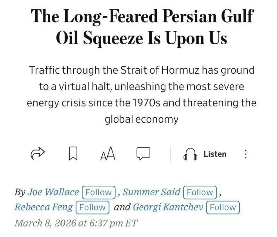 美国《华尔街日报》报道称,此次因美以对伊朗发动的战争所导致的石油危机是历史上规模最大的一次,是20世纪70年代石油危机的两倍。更严重的是,与以往石油危机不同的是,目前石油市场上根本没有备用产能可言。 不仅如此,由于霍尔木兹海峡被伊朗强行封控,现在海湾国家的油气运不出去,储油设施也都快被填满,迫使海湾国家接下来不得不关闭石油生产设施,石油产量将锐减,而全球油价还将大幅走高。