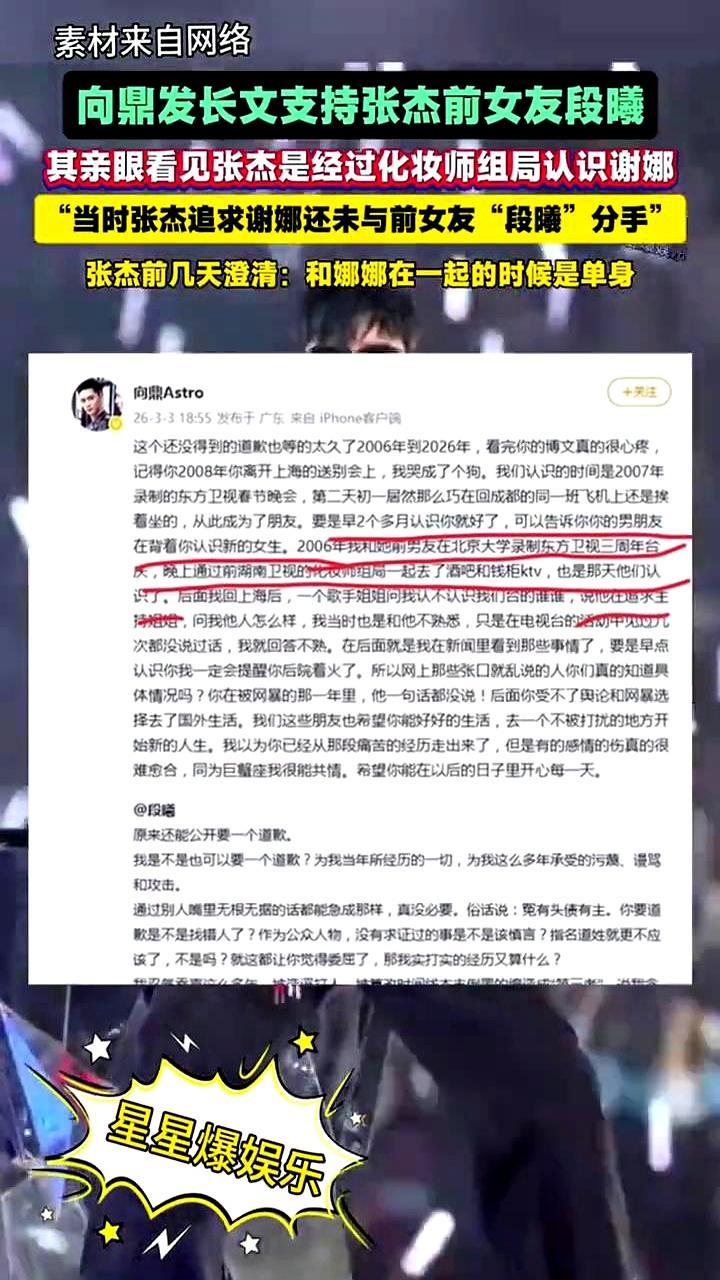 你敢信?张杰前脚刚说追谢娜时是单身,老熟人转头就把锤甩到了他脸上。 2006年的好男儿向鼎直接发长文,说自己亲眼撞见,当时张杰还没跟段曦分手,就通过化妆师组局在KTV认识谢娜,主动凑上去追人。 段曦说自己当年卖房卖车跑夜场驻唱,全拿出来供张杰拼事业,最后张杰单方面把她拉黑分了手,她还背了十几年掌掴谢娜的黑锅,挨了这么多年网暴连个说法都没捞着。 有人拿旧爱垫脚摘星,有人守着委屈过活,有人装聋作哑秀着恩爱当什么都没发生过。