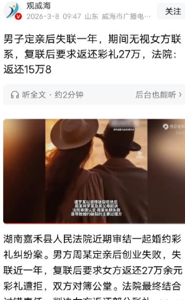 湖南嘉禾,男子相亲认识一女子,定亲时,给了女友199900元彩礼,还有价值23629元的四金,订婚后,男子出去创业,结果失败,他受不了打击,躲起来不愿见亲友,甚至和女友断了联系,失联近一年,一年后,男子又联系女友,给了她2个选择:要么登记结婚,要么退还彩礼。女友拒绝和他结婚,选择分手。不料,男子告上法院,要求女友返还27万余元彩礼等各项费用,法院判决有亮点。 事情得从两人相亲说起,都是湖南嘉禾本地人,经人介绍认识的,相处了一段时间,彼此觉得还行,就按当地习俗定了亲。定亲的时候,男方挺大方,一次性给了女方199900元彩礼,寓意长长久久,又花了23629元买了四金,项链、手镯、耳环、戒指一样不少,算下来,光这两项就快22万了。 定亲之后,男方琢磨着多挣点钱,以后结婚能更体面,就决定出去创业。女方也挺支持,想着等他稳定下来就登记结婚,平日里还会主动联系他,问问创业的进展,叮嘱他注意身体。可谁也没料到,男方的创业之路并不顺利,投入的钱打了水漂,创业彻底失败了。 按理说,创业失败很正常,从头再来就好,可这位男方心理素质实在太差,受不了这个打击,觉得没脸见人,不光躲着自己的亲友,连一直支持他的女友也彻底断了联系。电话不接、微信不回,女方到处打听他的消息,找了好几个月都没音讯,就这么失联了快一年。 女方这一年里,心里也挺纠结,一边担心他的安全,一边又觉得自己像个笑话,定了亲却被人晾在一边,连个说法都没有。她也曾想过放弃,可又抱着一丝希望,直到一年后,男方突然主动联系了她,一开口就没半点歉意,直接抛给她两个选择:要么现在就跟他去登记结婚,要么就把当初的彩礼和四金全部退给他。 换做谁,恐怕都接受不了这样的要求。女方心里的委屈一下子就涌了上来,这一年的等待和担心,换来的却是如此生硬的逼迫。她明确拒绝了结婚,觉得两人之间早就没有感情了,当初的婚约,也因为男方的失联彻底破裂,于是提出了分手。 本以为分手就结束了,可男方却不依不饶。见女方不肯退彩礼,他直接把女方告上了湖南嘉禾县人民法院,要求女方返还他27万余元,这里面除了当初的彩礼和四金,还加了相亲时的红包、定亲酒席等各项开销,把所有花过的钱都算在了里面。 庭审的时候,双方各执一词。男方说,当初给彩礼和四金,就是为了结婚,现在女方不肯结婚,按照法律规定,就该全额返还;女方则反驳,是男方先失联近一年,主动放弃了婚约,导致两人感情破裂,而且她为了准备结婚,也置办了不少嫁妆,花了不少钱,不该全额返还,甚至觉得自己才是受害者。 很多人都以为,没登记结婚,彩礼就该全额退还,可法院的判决,却打破了这个固有认知,这也是整个案子最亮眼的地方。法院审理后,首先明确了彩礼的范围——199900元定亲礼金、价值23629元的四金,再加上定亲时赠送的情侣戒指折价款2695元,合计226224元,这部分属于以结婚为目的的大额财物,认定为彩礼。 而男方主张的相亲红包、日常小额转账、酒席花费等,属于增进感情的日常消费,不算彩礼,不予支持。 接着,法院重点考量了双方的过错。虽然双方未办理结婚登记,符合彩礼返还的法定条件,但男方因为创业失败就失联近一年,主动切断与女方的联系,是导致婚约破裂、感情无法继续的主要原因,存在明显过错。 同时,女方为了履行婚约,也置办了嫁妆,有实际支出,而且两人属于异地恋爱,从未共同生活,综合这些因素,法院没有判决女方全额返还,也没有判决不予返还,而是酌定女方按70%的比例返还彩礼。 最终,法院判决女方及其父母返还男方彩礼158357元,双方都没有上诉,女方也已经主动履行了判决。可能有人会觉得,男方创业失败可怜,也有人觉得,女方被晾一年更委屈,但法院的判决,恰恰体现了公平公正,既没有偏袒任何一方,也给所有人上了一课。 其实,彩礼本身是传统习俗,寓意着对婚姻的美好期盼,而不是用来要挟对方的工具。男方创业失败可以理解,但逃避解决不了问题,失联近一年,不仅消耗了女方的感情,也违背了婚约的诚信原则;女方拒绝结婚,也是基于感情破裂的合理选择,并非恶意占有彩礼。 对比现实中很多彩礼纠纷,有的男方不管自身过错,只要没结婚就要求全额退彩礼;有的女方则不管婚约是否存续,执意不退还彩礼,而这起案子的判决,明确了“过错方担责”的原则——就算符合彩礼返还的法定条件,也要看双方的过错程度、实际支出等因素,酌情返还,这既保护了给付方的合法财产权益,也兼顾了女方的合理权益,更引导大家树立正确的婚恋观。 这起案子也给所有准备相亲、定亲的人提了个醒:彩礼可以给,但要量力而行,不要盲目追求大额彩礼;婚约可以订,但要坚守诚信,不要轻易违背承诺。遇到挫折不逃避,遇到矛盾不激化,才是对待感情和婚约的正确态度。 最后想问大家,你觉得这个判决合理吗?如果是你,遇到这样的情况,会怎么做?