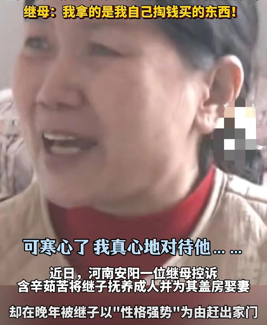 太寒心!女子诉苦:“含辛茹苦抚养继子12年,继子婚后嫌我性格强势,联合亲戚强行更换门锁,将我赶出家门!” (信息来源:青岛新闻网) 近日,河南一位继母向记者哭诉,称自己含辛茹苦将继子从幼年抚养成人,甚至为其出资建房娶妻。没成想继子婚后却以“性格太强势”为由,将继母和生父一起逐出家门!太让人寒心! 据悉,女子做继母的12年间,一直都是租房照顾一家老小的生活。12年,她事无巨细的照顾着继子的衣食起居,将他扶养成人。 继子到了成家的年纪,继母又拿出自己多年的积蓄为继子盖房娶妻。可是婚后继子却联合亲戚强行更换了家中门锁,并将继母和生父一起赶出家门,理由是“继母性格太强势”。 “寒心呐,实在是太让我寒心了!”面对镜头,继母泣不成声,感觉自己这么多年的付出,最后却落得一个这样的下场。 这时,继子的舅妈却站出来指责继母:“你搬出去住了,还把孩子结婚买的东西都搬走了!有你这样当妈的吗?” 对此,继母表示:“那些东西都是我真金白银买来的,他这样对我,我凭什么不能搬走!” 为了给自己争一口气,继母尝试拿回所盖新房的归属权。但是丈夫和继子都没有任何凭证可以证明这套房子的归属权。若真要明确归属,还需要政府相关部门的介入! 很多人都说,不是自己的亲生的孩子,就算养的再久,就算付出再多的真心,也不是自己亲生的,不能寄予太多的期望。 也有人为继母感到庆幸,庆幸在还能干还能争的时候就看清了继子,还有转圜的余地。若真是到了躺在床上不能动的那一天,那才是真的绝望啊! 都说养育之恩大于天!电视剧经常上演的戏码也是主角感恩养父母的养育之恩,选择不负养父母!可是戏码终究是戏码,有的人将感恩之心记心间,涌泉相报!有的人将养育之恩抛之脑后,令人寒心! 对此,你怎么看呢?继母 河南