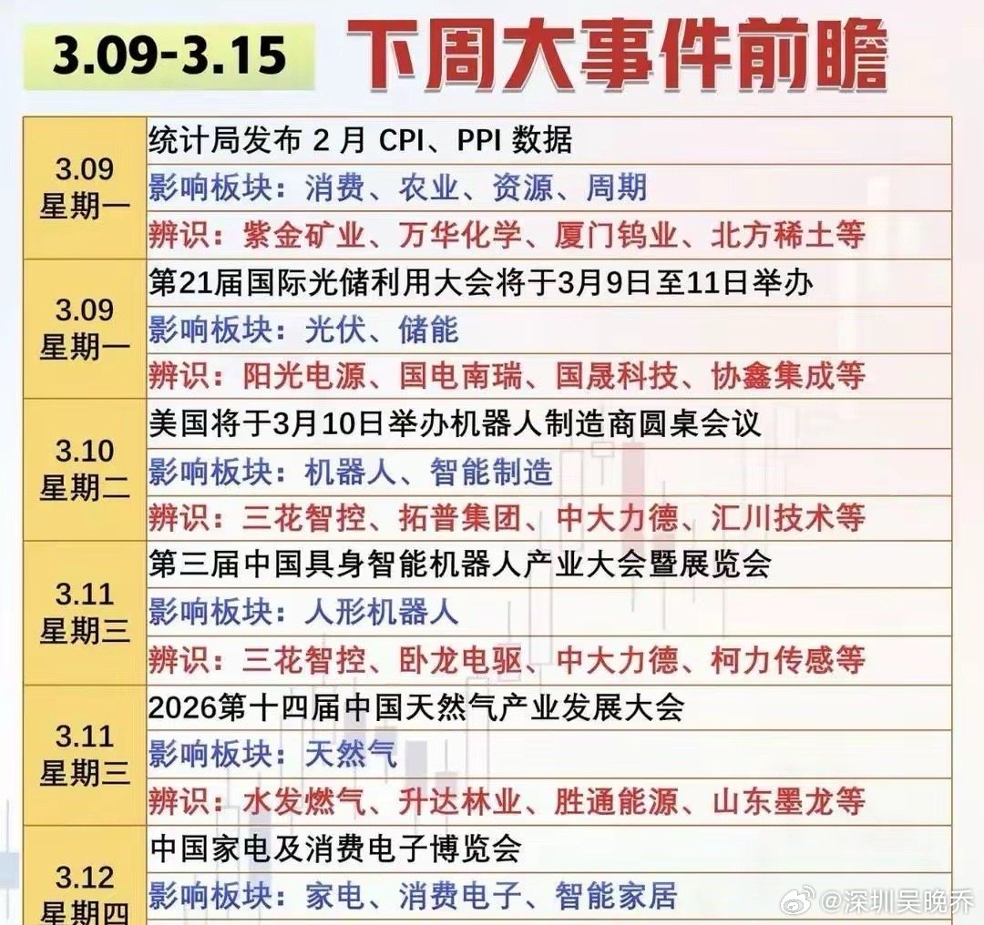 下周,几个八竿子打不着的行业大会,可能会在别的地方掀起连锁反应。你看,3月9号开始,这一周排满了。先是苏州的光伏储能大会,紧跟着是上海的机器人产业大会,再叠加上海的家电电子展,甚至还有商业航天会。表面上各开各的,但它们暗地里在互相递纸条。光伏储能大会,炒的是绿色能源的“电池包”。机器人大会,特别是“具身智能”,炒的是AI的“硬件身体”。家电展,则是把技术塞进千家万户的“场景”。这像不像在组装一个未来巨人的不同部位?能源是血液,机器人是四肢,智能家电是神经末梢。所以,别只盯着单个会议。这一连串事件,可能是在为“AI能源化”和“能源智能化”这种更大的故事铺路。机会窗口,往往就在这种交叉地带悄悄打开
