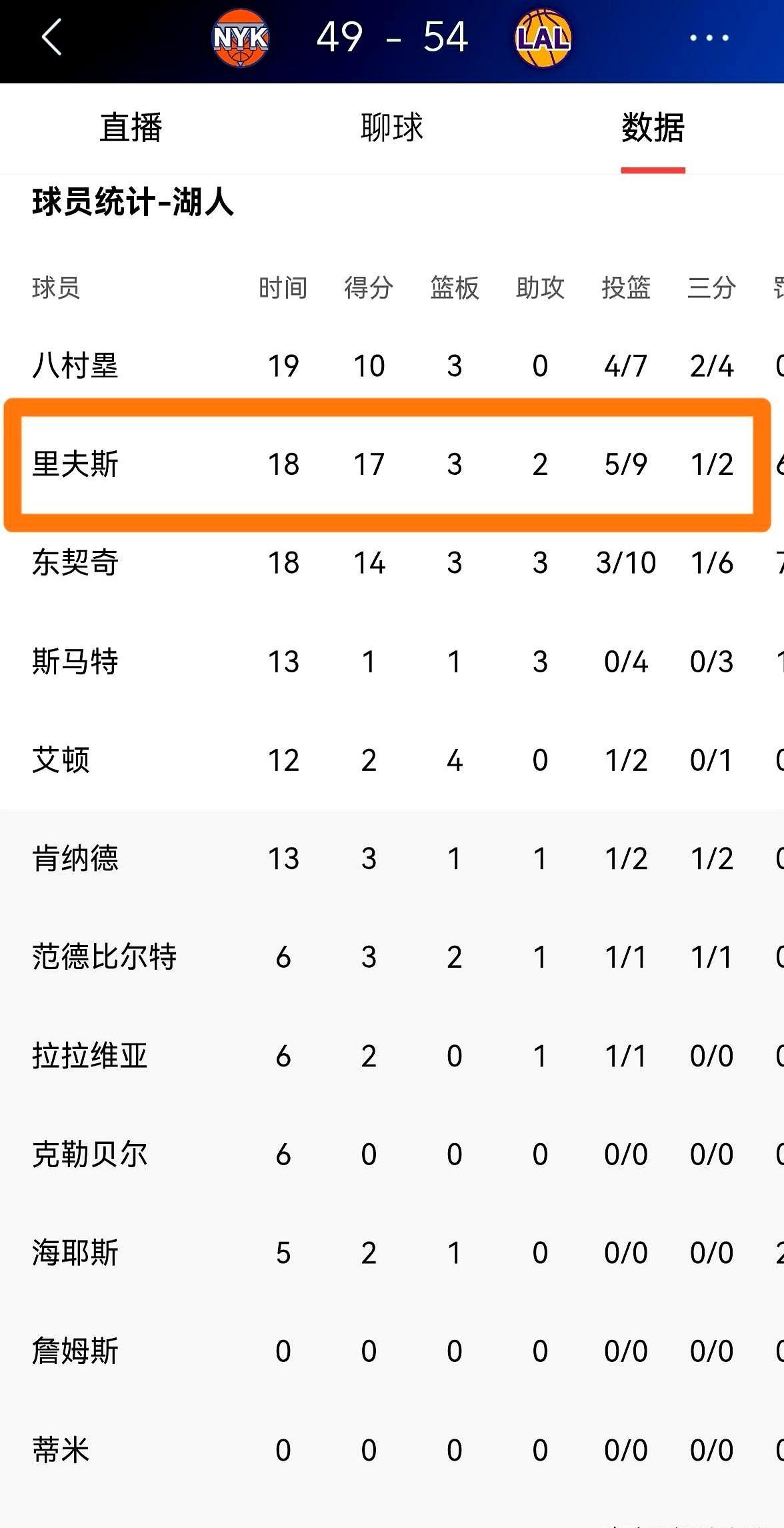 没有詹姆斯的湖人,胜率居然冲到了65%。 3月9日对阵尼克斯的比赛,湖人全场从未落后,110:97拿下胜利。 里弗斯上半场18分钟砍17分,硬生生把湖人的领先优势咬到了中场。 全场他拿25分,和东契奇的35分合砍60分,把尼克斯三分防到34中8。 赛前雷迪克刚要求他打得更有侵略性,这是他近20天第一次拿20+。 目前东契奇+里弗斯带队、老詹缺阵的比赛,湖人9胜2负,胜率81.8%。 这场赢球后湖人和掘金并列,靠分区优势暂列西部第五。 你觉得这套双核阵容,本赛季能摸到西部前二吗?