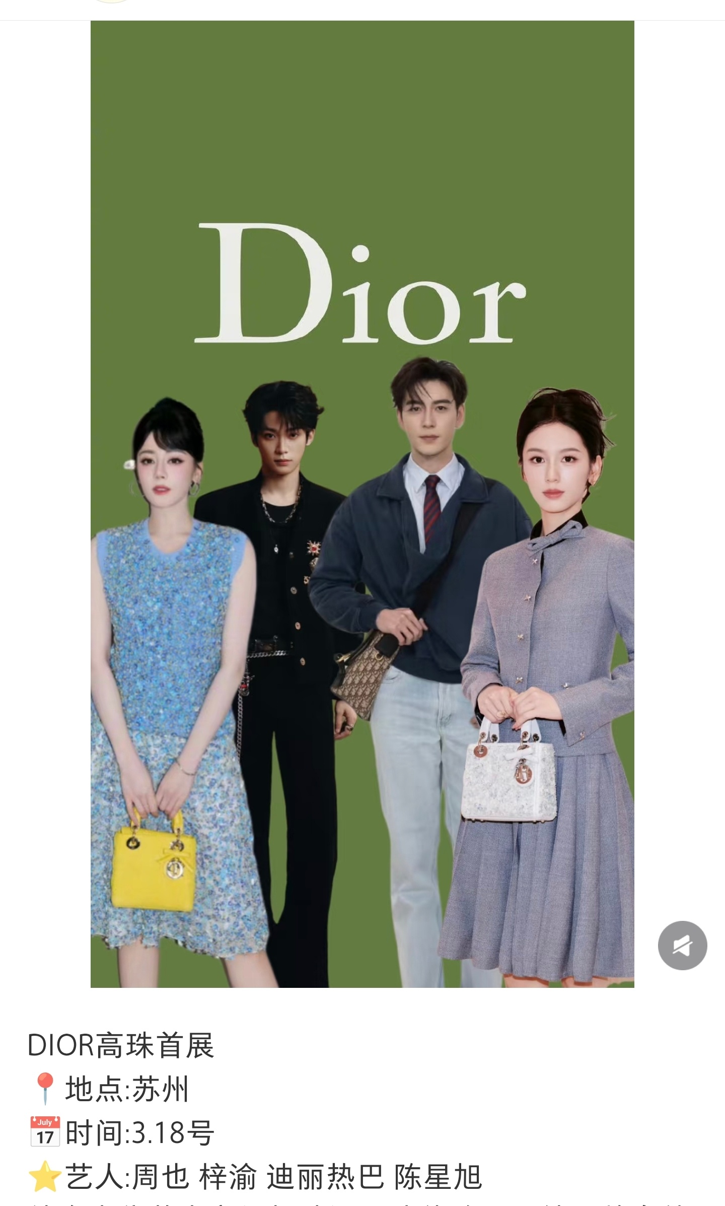网传,3.18,苏州迪奥高珠展嘉宾——迪丽热巴,梓渝,陈星旭,周也。🌸🌸🌸🌸