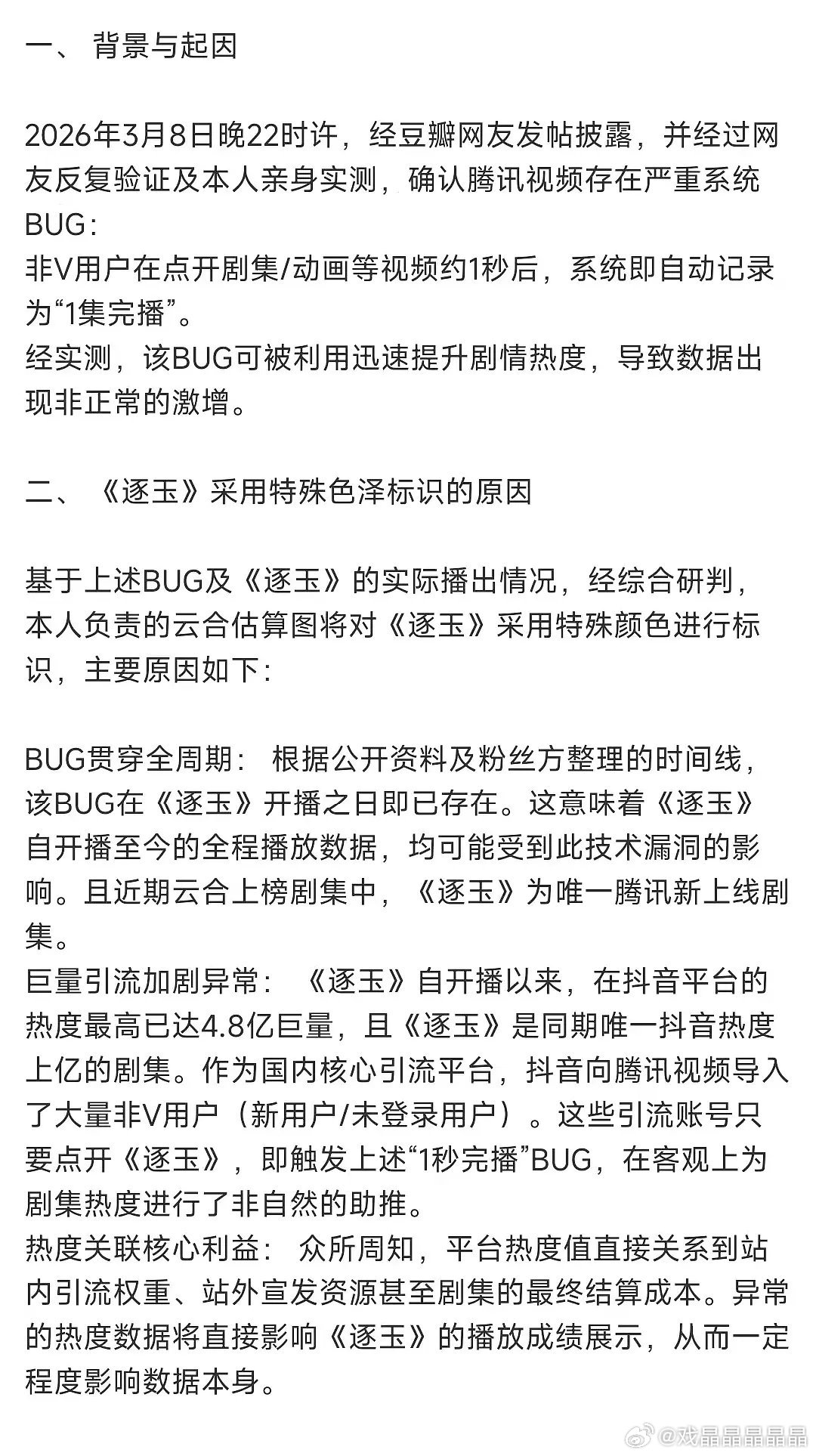 这两位解释的都是这个意思:抖大推流+抖接口免费看+腾讯bug,叠加起来导致逐🐟数据完全造假失真。腾讯视频 版本回调 (不过不是几秒就算一集,而是点击一秒即计入全集观看bug,这还可能导致后面集数越多,播放量越呈倍数虚假增长) 网友举报逐玉收视率造假