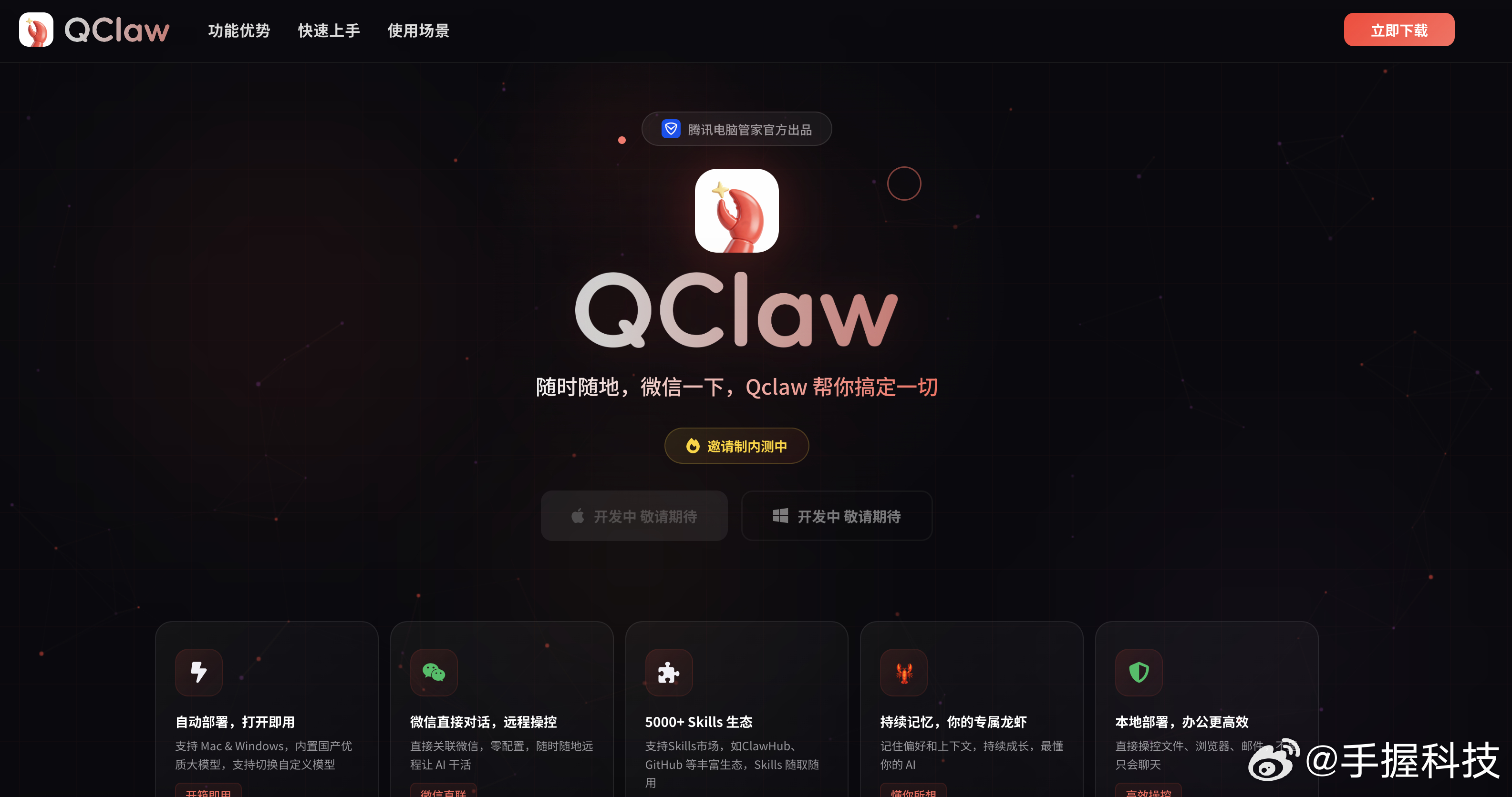OpenClaw接入微信和QQ还是那个企鹅,就是这么敏捷,但是去官网看了看,还在邀请制内测中,暂时无法下载。