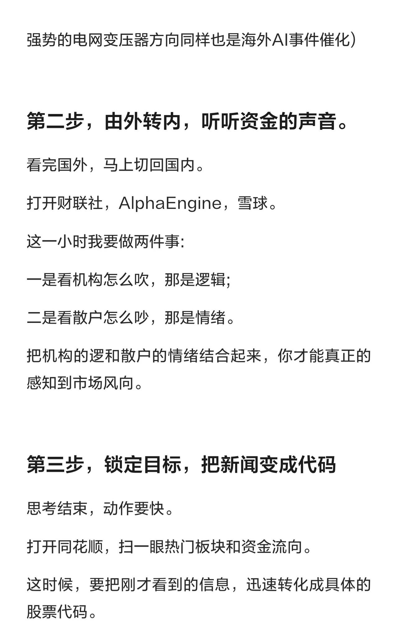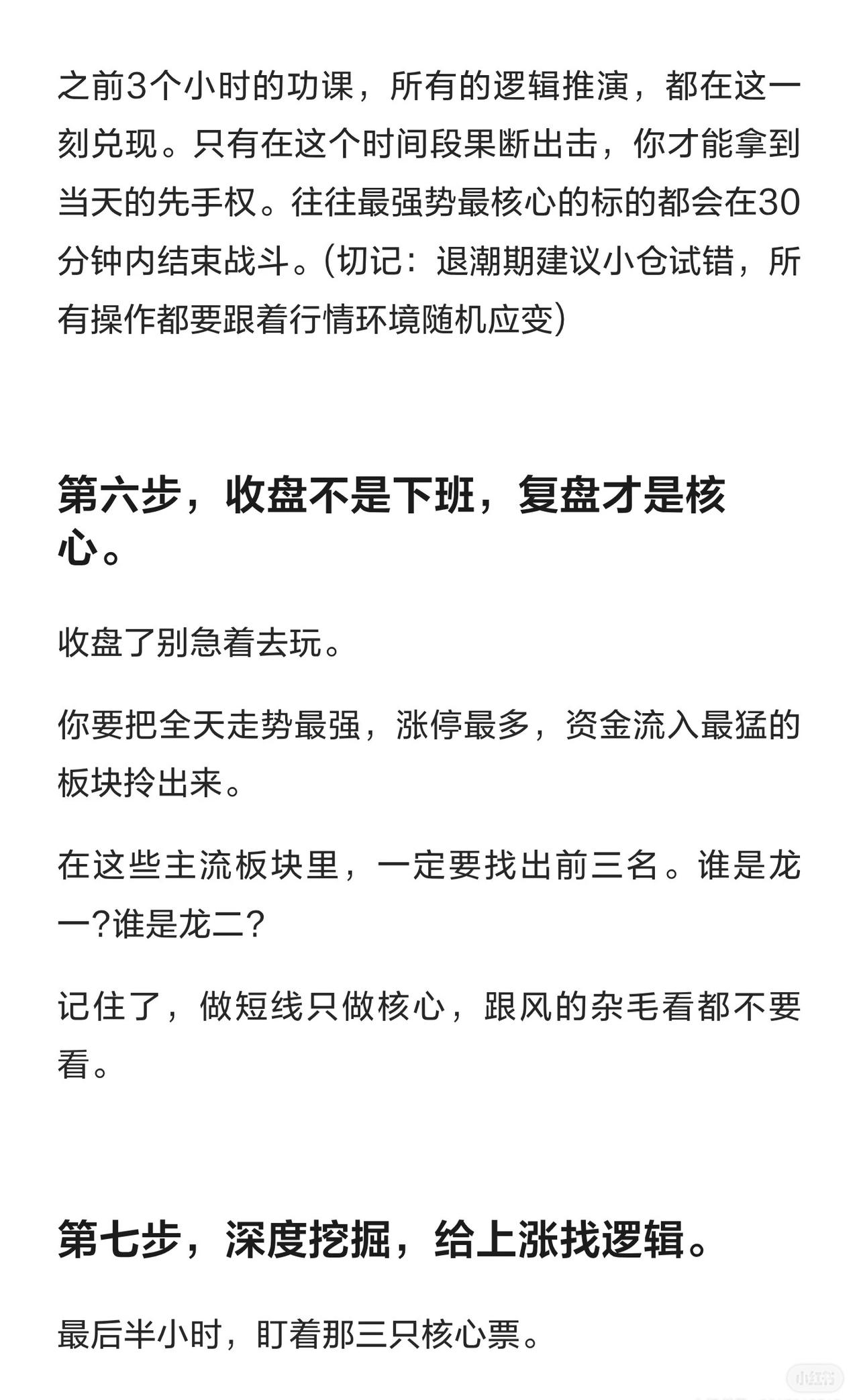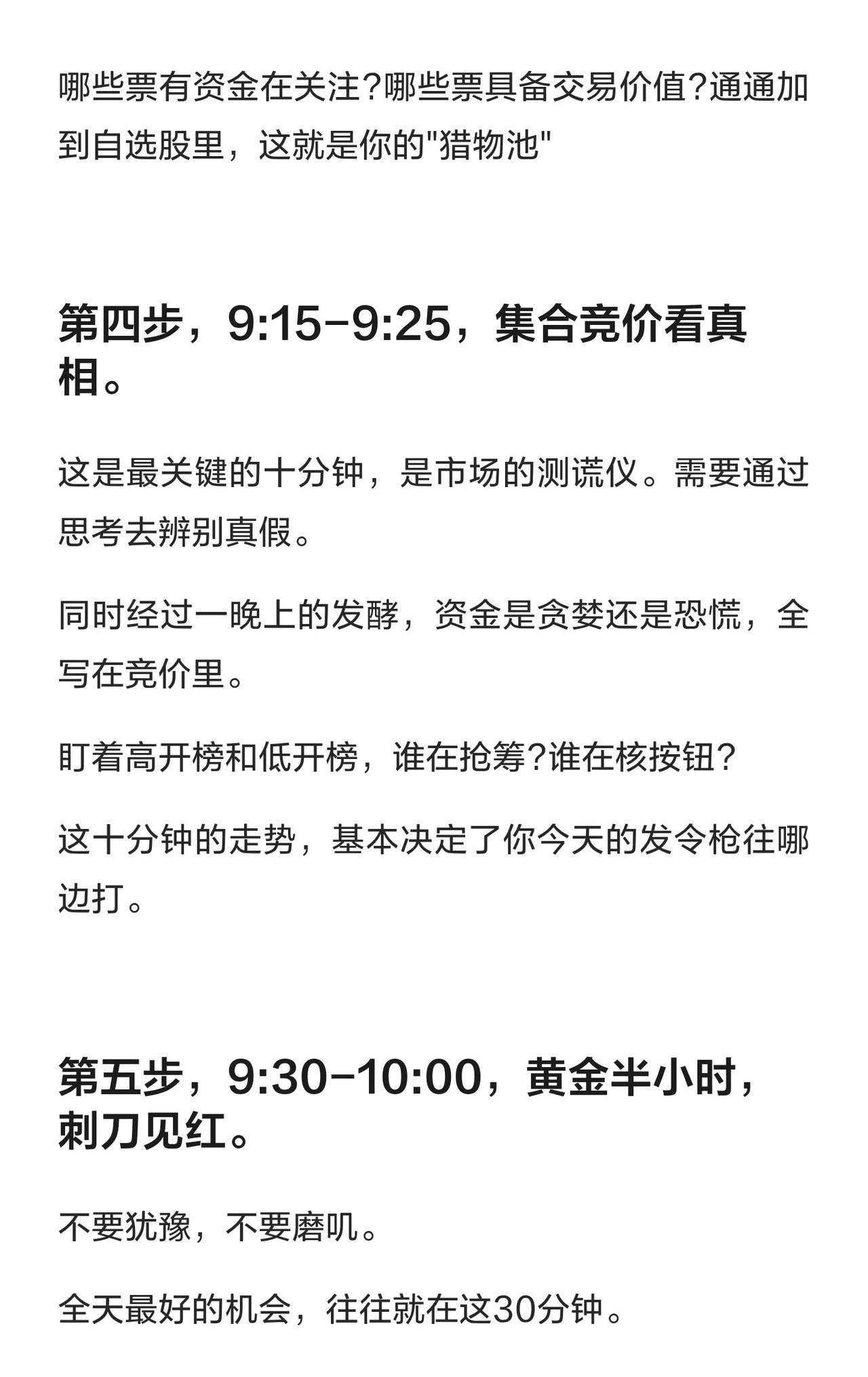 这位从6万炒到550万的“大神”,总结了一套短线炒股实战精髓,核心可概括为 “早研内外、锁标竞价、黄金出击、复盘深挖” : 1. 早间研报(6:30起):先花1小时看国际新闻、海外行情及全球科技前沿(A股风向常受大洋彼岸影响,科技映射是关键题材); 2. 国内资金(转内):1小时看财联社、雪球等平台,机构逻辑+散户情绪结合,感知市场风向; 3. 锁定目标:打开同花顺扫热门板块与资金流向,将有效信息转化为自选股“猎物池”; 4. 集合竞价(9:15-9:25):通过高开/低开榜辨资金贪婪/恐慌,确定当日操作方向; 5. 黄金半小时(9:30-10:00):果断出击“猎物池”标的,拿当天先手权(退潮期小仓试错,随行情应变); 6. 收盘复盘:拎出全天最强板块,找出前3名“龙一、龙二”,做短线只抓核心龙头; 7. 深度挖掘:最后半小时盯核心票,结合主流信息挖基本面逻辑(逻辑硬才敢拿大牛股)。 核心逻辑:把炒股当职业,靠“复盘+逻辑+执行”取胜(而非运气),短线只做核心、跟风杂毛不看。