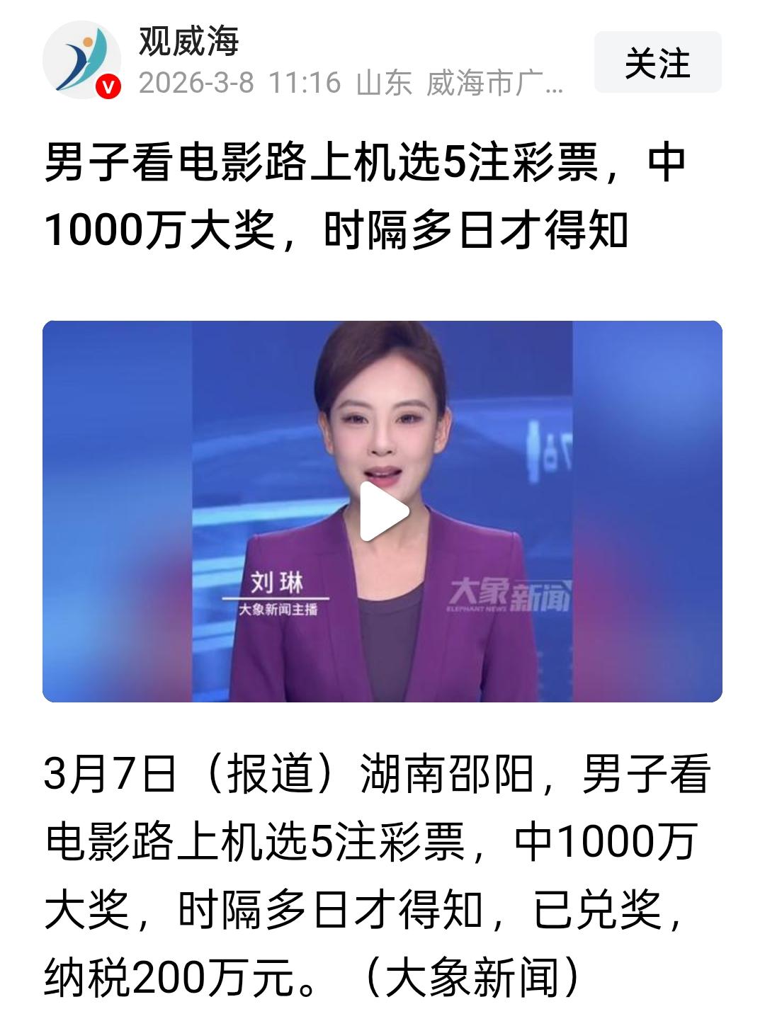 怎么感觉眼下是买彩票的最佳时机?是真的这样 ,还是我有错觉? 最近看到两条新闻。一条说的是一位男子在云南丽江旅游,顺手买了15元彩票。最后你猜怎么着,喜中1034万元大奖。 还有一条新闻说的是,湖南邵阳一男子,在去电影院看电影的路上, 顺手以机选的方式购买了5注彩票,居然也中了1000万元大奖。 你瞧瞧这运气,不期而至简直挡都挡不住。一个在旅游途中,一个在看电影的路上,都是暂时起意顺手而为买彩票,结果都中1000万元大奖。 感觉彩票真的很神奇,有人每天都买,风雨无阻,十分执着,最多只是偶尔中过十元八元的小奖,从来与大奖无缘。 可是,有人随手这么一买就是千万元的大奖。看样子,买彩票中奖,真的是“无心插柳”的事情 ,求之不得 ,靠的是缘分。 或许,缘分到了,财富自然来了。