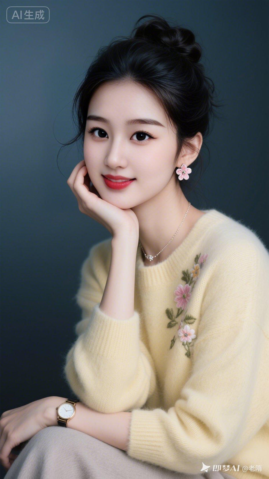 绝色佳人黑发微乱盘起,肤白貌美妆容精致。身着杏黄羊绒绣花宽松套头衫,手托下巴浅笑,大眼眼线睫毛纤毫毕现,粉唇动人。佩戴华丽花耳环、小巧项链与手表,冷调暗光背景,8K超高清半身照,肌肤与眼部细节拉满。
