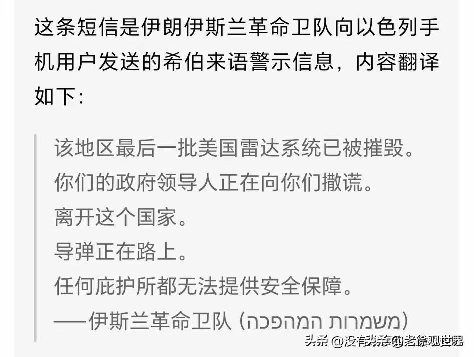 伊朗杀人诛心啊!伊朗革命卫队用希伯来语发送短信给以色列民众,告知当地反导系统已经被突破,导弹正在到来的路上。温馨提示民众赶紧离开自己的国家,以免白白陪葬! 试问收到信息的民众作何感想?民心惶惶不可终日,不攻自破,杀人诛心!伊朗 伊朗能扛住美国的军事打击吗