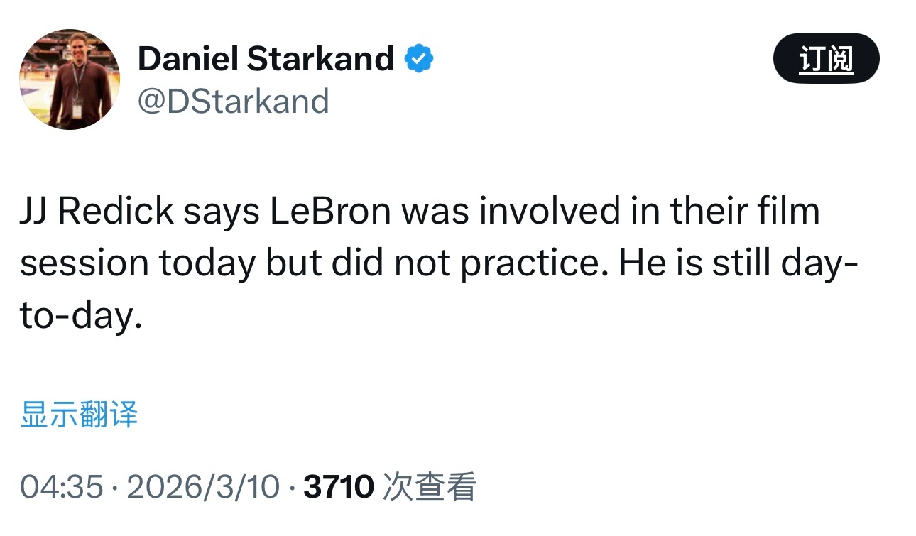 詹姆斯今天参加了录像分析会议,但缺席了训练,他仍在每日观察名单。