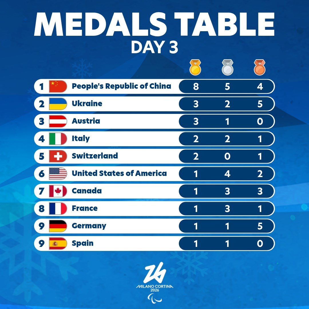 2026年米兰冬残奥会截止第三比赛日,中国代表团8金5银4铜,领跑金牌榜和奖牌榜