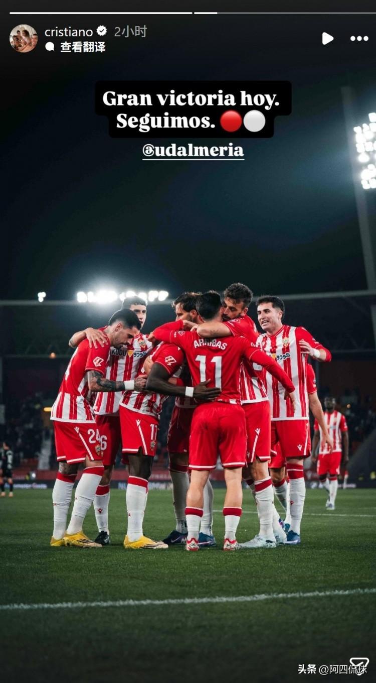 足球运动员投资眼光,C罗称第二,没有人敢称第一。近日,C罗更新社媒,晒出了自己控股25%的阿尔梅里亚俱乐部球员的图片。 目前,阿尔梅里亚排名西乙第二,本赛季升级西甲的可能性非常大,球队升级后市值大涨,C罗的投资又有了回报。 有一说一,C罗投资阿尔梅里亚可谓一举两得,如果和利雅得胜利关系破裂,C罗就可以到阿尔梅里亚踢球,可以无缝衔接。此前,C罗罢赛不踢球,说明他和利雅得胜利俱乐部的关系并不和谐。投资阿尔梅里亚俱乐部,也算是C罗给自己找的一条退路。 那么问题来了,“老板C罗正在热身”会不会上演,C罗有没有可能去阿尔梅里亚踢球?C罗