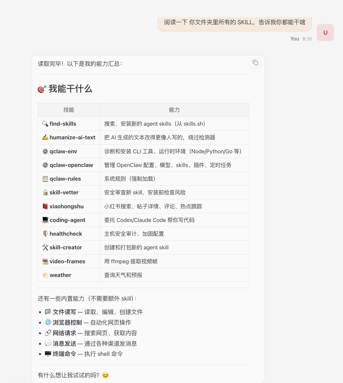替换了自己的 API key,也就可以直接在webchat 把 QClaw 唤醒起来。。。然后看看它的技能表