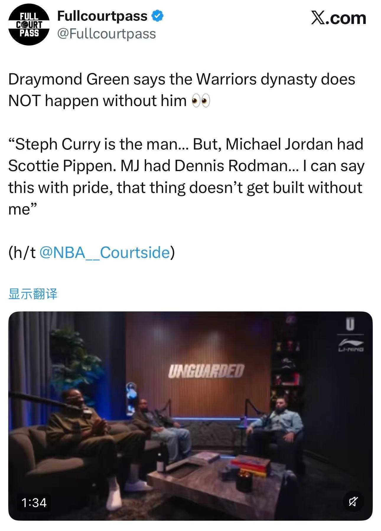 “库里是球队的灵魂,但乔丹有皮蓬,有罗德曼,我可以很自豪的说,没有我,就不会有勇士的辉煌。”
