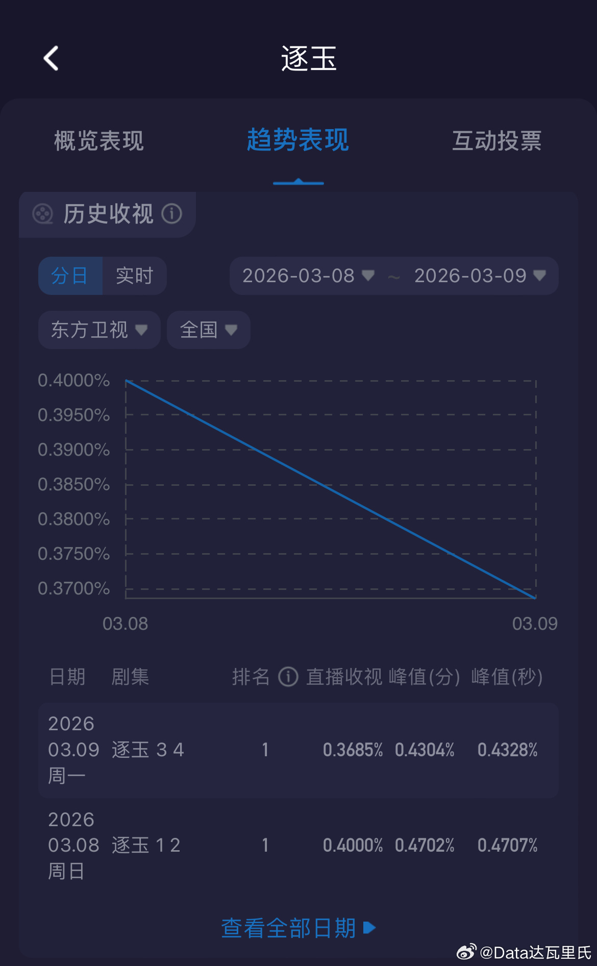 逐玉收视率 3-4集酷云收视0.3685%,较首日降了,1-4集均0.3843CVB首日1-2集0.453%,次日未出