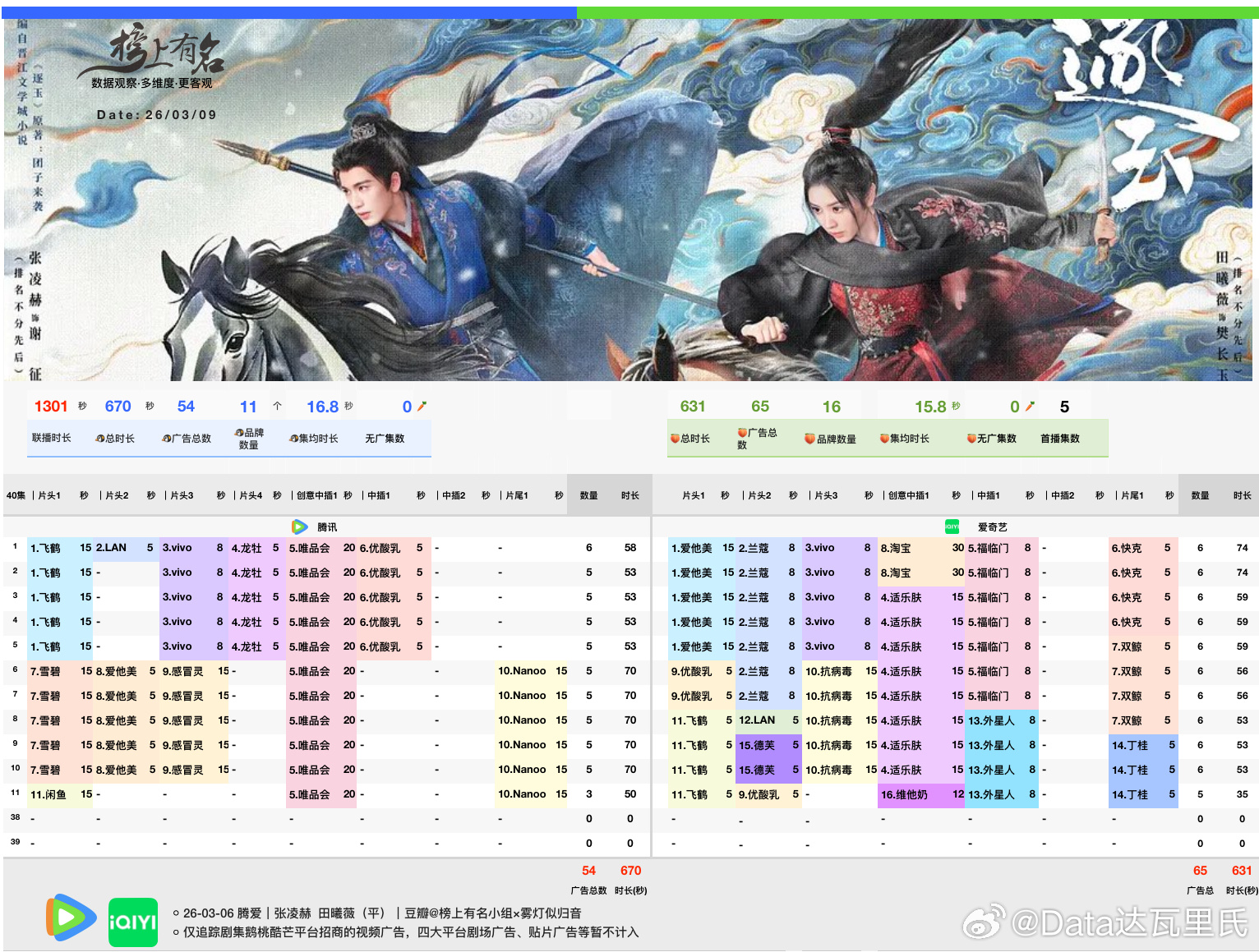 逐玉招商 鹅桃总时长1301s(仅视频广🐧最新单集降至3广50s,共11品牌,总时长670s🥝最新单集5广35s,共16品牌,总时长631s