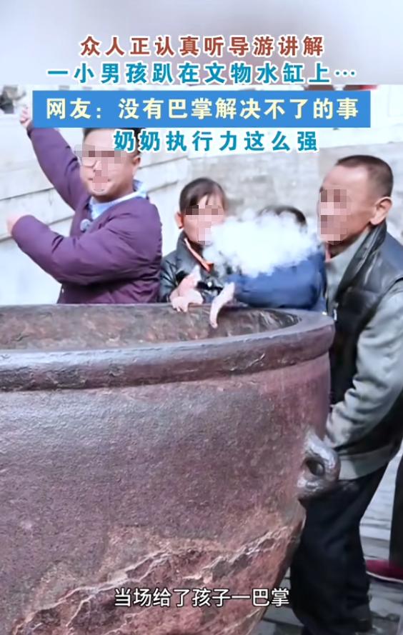 “干得漂亮!”3月5日,北京,一导游正在故宫讲解,一名小男孩突然凑上前,开始攀爬古缸,导游发现后温柔劝阻,旁边的爷爷也过去抱住小男孩,哄他下来,可小男孩就是不撒手,他的奶奶见状,直接给男孩一巴掌,男孩也彻底老实!网友:看爽了! 三月的北京,还带着点春寒。清晨的故宫大门刚开,红墙金瓦下,导游撑着小旗,嘴里不断唠叨着紫禁城里一砖一瓦的历史。 就在养心殿和武英殿之间那一处,两口巨大的鎏金铜缸静静杵着。 却没想到,就在这份安静里杀出来一个活蹦乱跳的小男孩。 他两步蹦到铜缸边,眼睛发亮,直接用手攀住缸沿,手脚并用地爬了起来。 导游看见这阵仗,先是下意识愣了一下,随后赶紧温声劝说:“宝贝,这缸不能爬,容易危险,也很珍贵。” 孩子压根没在意,反倒在大人越阻止时越来劲。 爷爷冲过去,好声好气地喊着,伸手轻推,他自己怕孙子摔着,也怕孙子惹事。 可那小男孩偏就跟铜缸杠上了,抓得更紧,场面有点尴尬,就在这时,奶奶突然上前,二话不说,抬手就是一巴掌。 那清脆一声,场面安静了三秒,连导游都愣住了。小男孩瞬间停了手,蔫头耷脑地下了地,眼圈红了,但再没碰那口缸。 这段视频甫一流出,网友里沸腾声不断:“看爽了”“奶奶干得漂亮”。 叫好声里,藏着人们对出手果断捍卫公德的赞赏,也夹杂着对长期没完没了的“熊孩子”现象的无声叹息。 有人忍不住好奇,啥样的铜缸儿,总得让这么多大人都动了真性情,连温柔的劝说都比不过老一辈的一记快刀斩乱麻? 先说说这缸。故宫的铜缸,尤其门口的鎏金那一批,历史可比大多数人来的还久。 乾隆年间下旨打造,工匠用尽力气,选了最好的黄铜,顶着烈日将铜水倒进巨大的模具里,缸壁厚实到一人抱不过来。 别被那层金闪闪的外表迷了眼,其实它们的正经身份,是当年皇宫防火的头号功臣。 整个故宫全是木结构,走廊废墟、屋檐漏雨,一不小心火星子都能引发山呼海啸。 铜缸平日里灌满水,遇事就能迅速舀水扑救。 据记载,一只铜缸重三千多斤,能蓄水三千多升。 谁也想不到,在这些缸的历史里,不仅有乾隆的威严,还有一段民族的伤疤。 1900年八国联军打到北京,侵略军进了紫禁城,看见这些闪光的铜缸,压根没想着防火,第一反应是动手刮金。 传说有的士兵拿着刺刀一刀刀刮下去,缸身留下无数划痕,金箔片片脱落,故宫的救火神器,被生生剥成了一身伤。 时至今日,只要靠近细看,古缸表面的划痕依然清晰。 从乾隆下令打造,到八国联军的凌辱,铜缸的命运很复杂。 它经历过帝王的兴盛,也见证了中华民族苦痛的时刻。 后来修复师每次擦拭,都格外小心,生怕再添一处新的“疤痕”。 所以不难理解,为啥每当有游客靠近甚至攀爬,全场的保安和导游都紧张得如临大敌。 而在现场,爷爷那样温声软语,是大多数家庭的日常。 孩子调皮,总想着用哄、用劝,把大事化小。 可奶奶的那一巴掌,简单、粗暴,这就是老一辈带孩子的方式,动作雷厉风行,不讲道理,有用也有风险。 有人赞“手起巴掌落,熊孩子就得治”,也有人担心孩子自尊心、童年阴影啥的。 网友说,“看爽了”,其实看的是一种果断,是在无数忍耐和说教无效后的爆发。 在评论区,有人调侃孩子下次想爬缸都得先想想疼不疼,有人却觉得,规则靠“打”才进脑袋,这本身就是个悲哀。 毕竟,文明社会讲究理性,人人都希望用讲道理去说服,但真碰上传统惯势和现场急火,谁又能真的保持平和呢? “干得漂亮”,是网友给奶奶的评价,也是给每个捍卫传统和文明的人一声肯定。